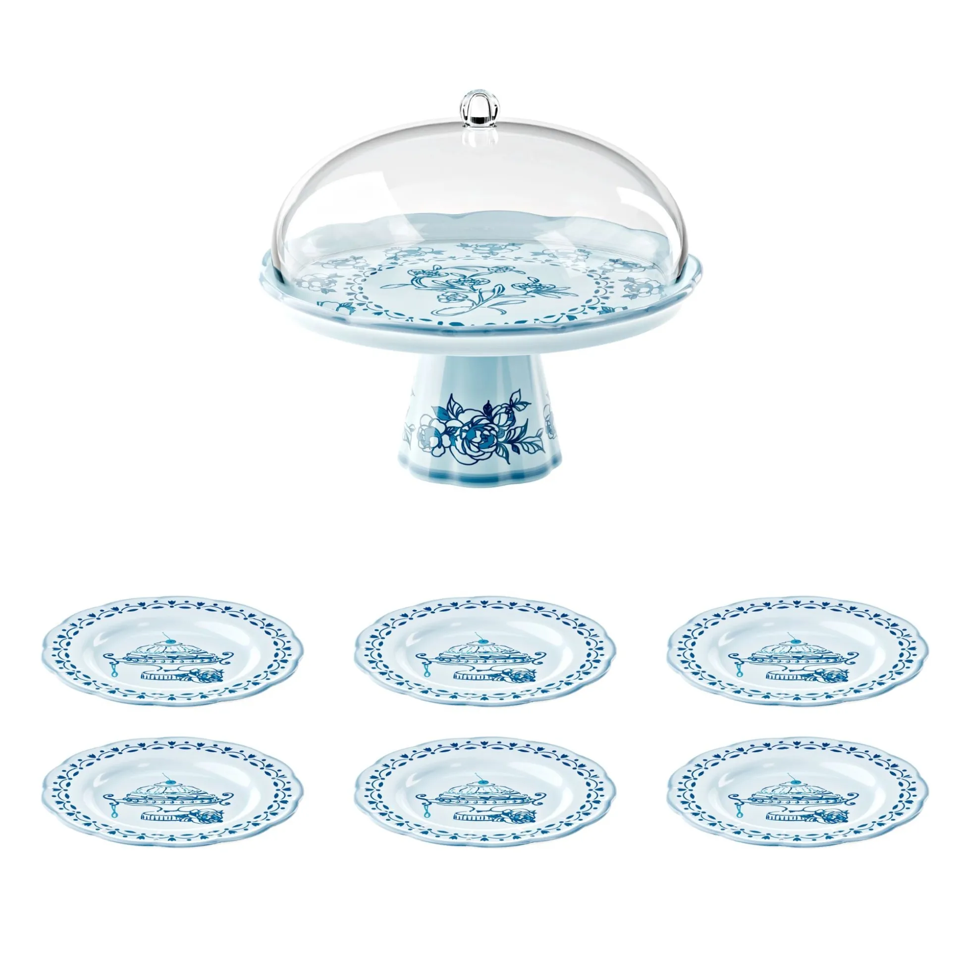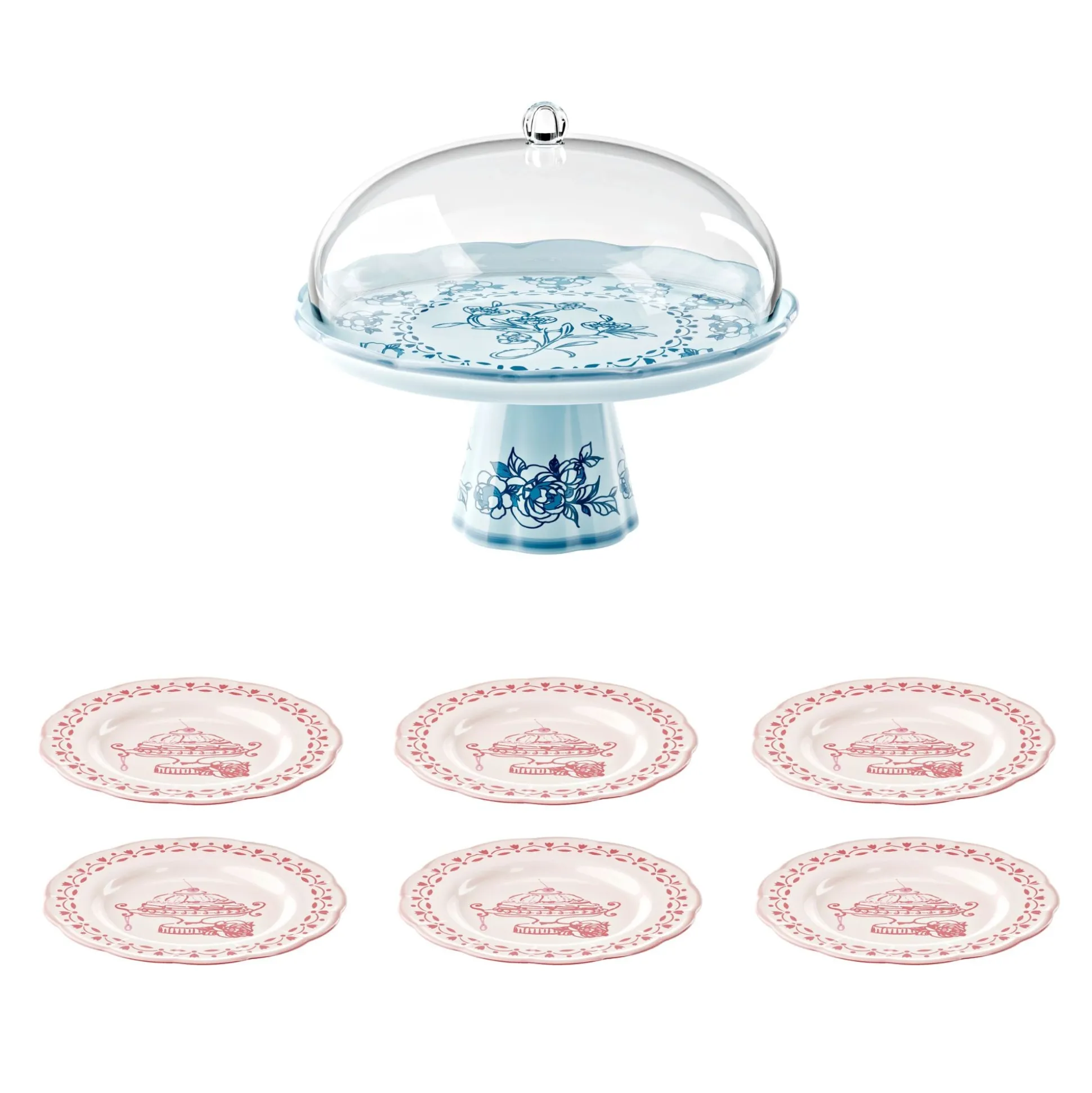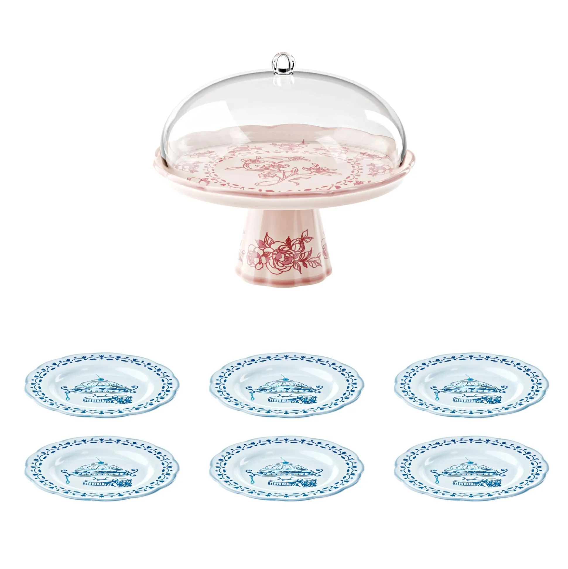 Porta eleganza e stile sulla tua tavola con questa Alzata con Campana e 6 Piattini Dessert Coordinati. Perfetta per servire torte, pasticcini o piccoli dessert, il set unisce funzionalità a un design raffinato. La campana mantiene i tuoi dolci freschi, mentre i piattini coordinati completano una presentazione armoniosa. Ideale per intrattenere gli ospiti, per occasioni speciali o come regalo raffinato.