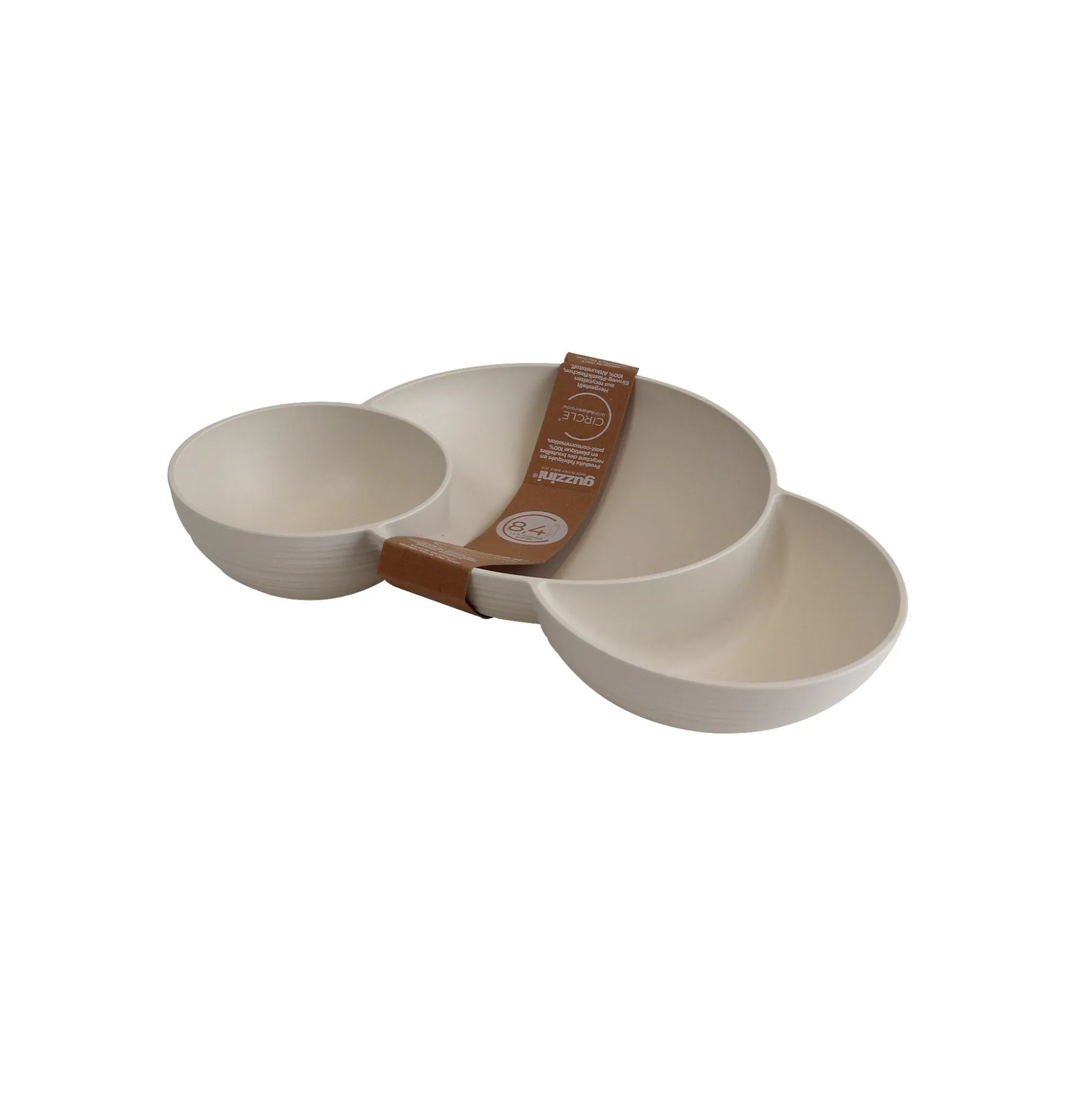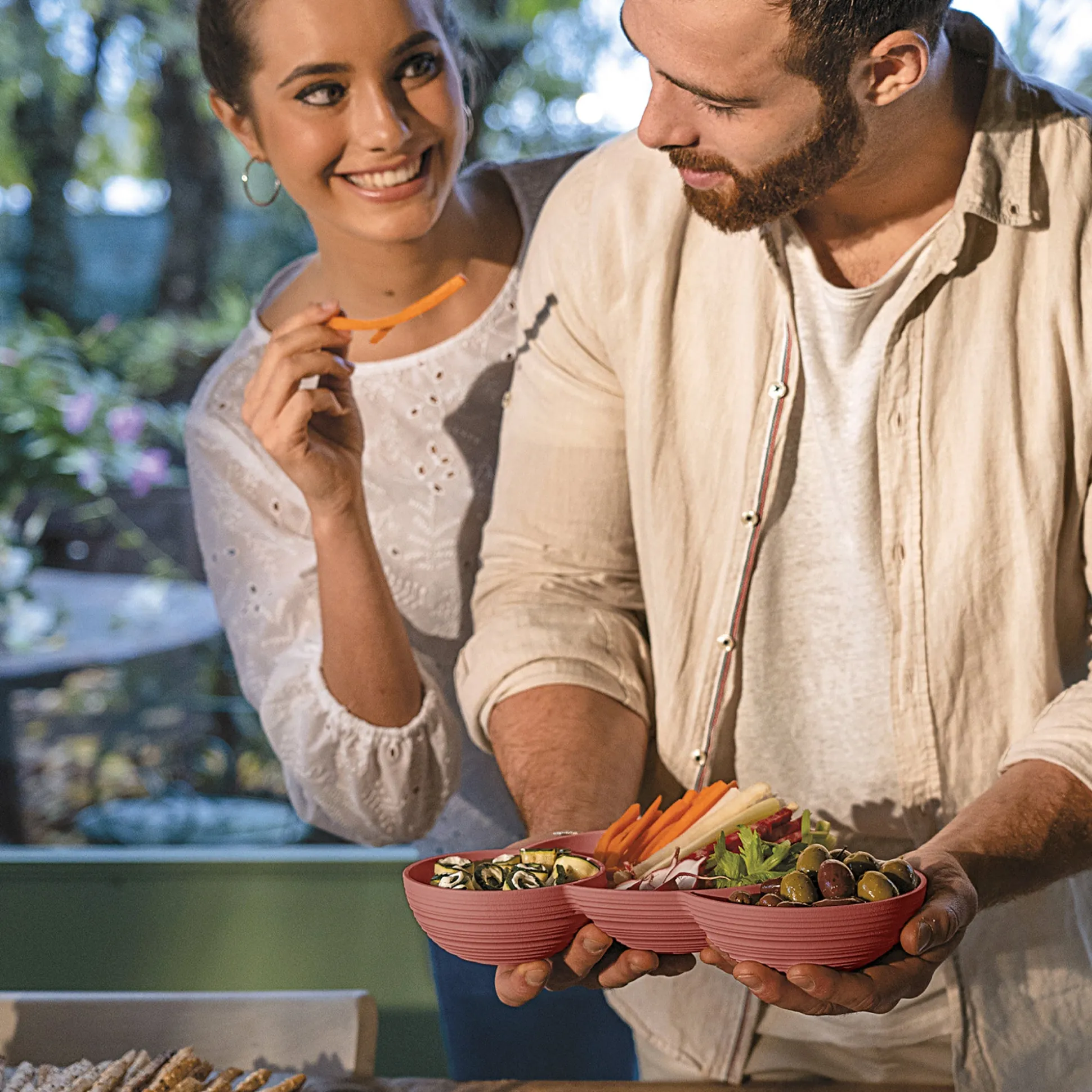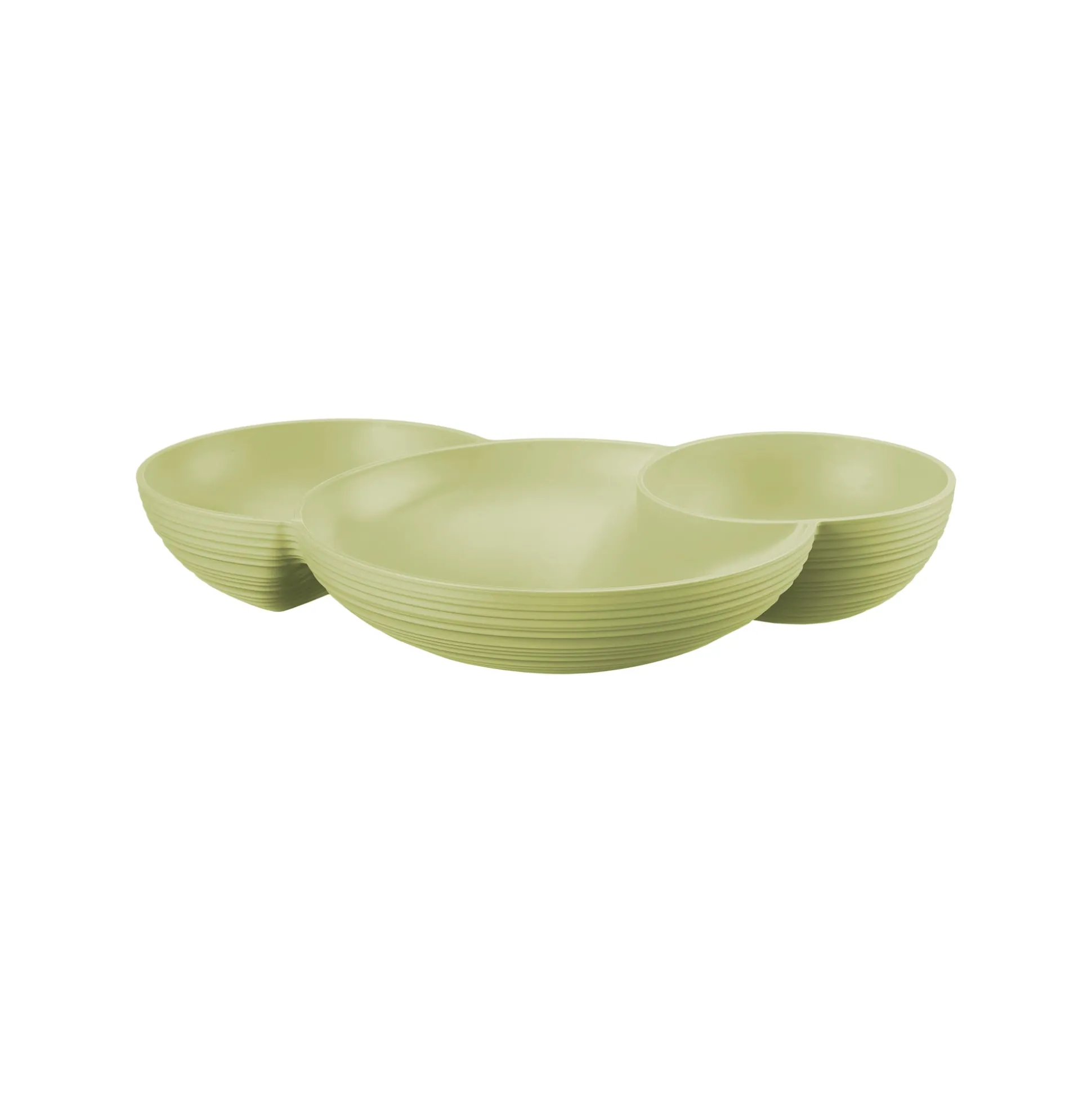 L’antipastiera è suddivisa in tre contenitori che possono ospitare dalle arachidi alle olive, dalle verdure fresche julienne a sfiziosi tocchetti di formaggio. Le forme sono sinuose e accattivanti, la funzionalità è garantita.