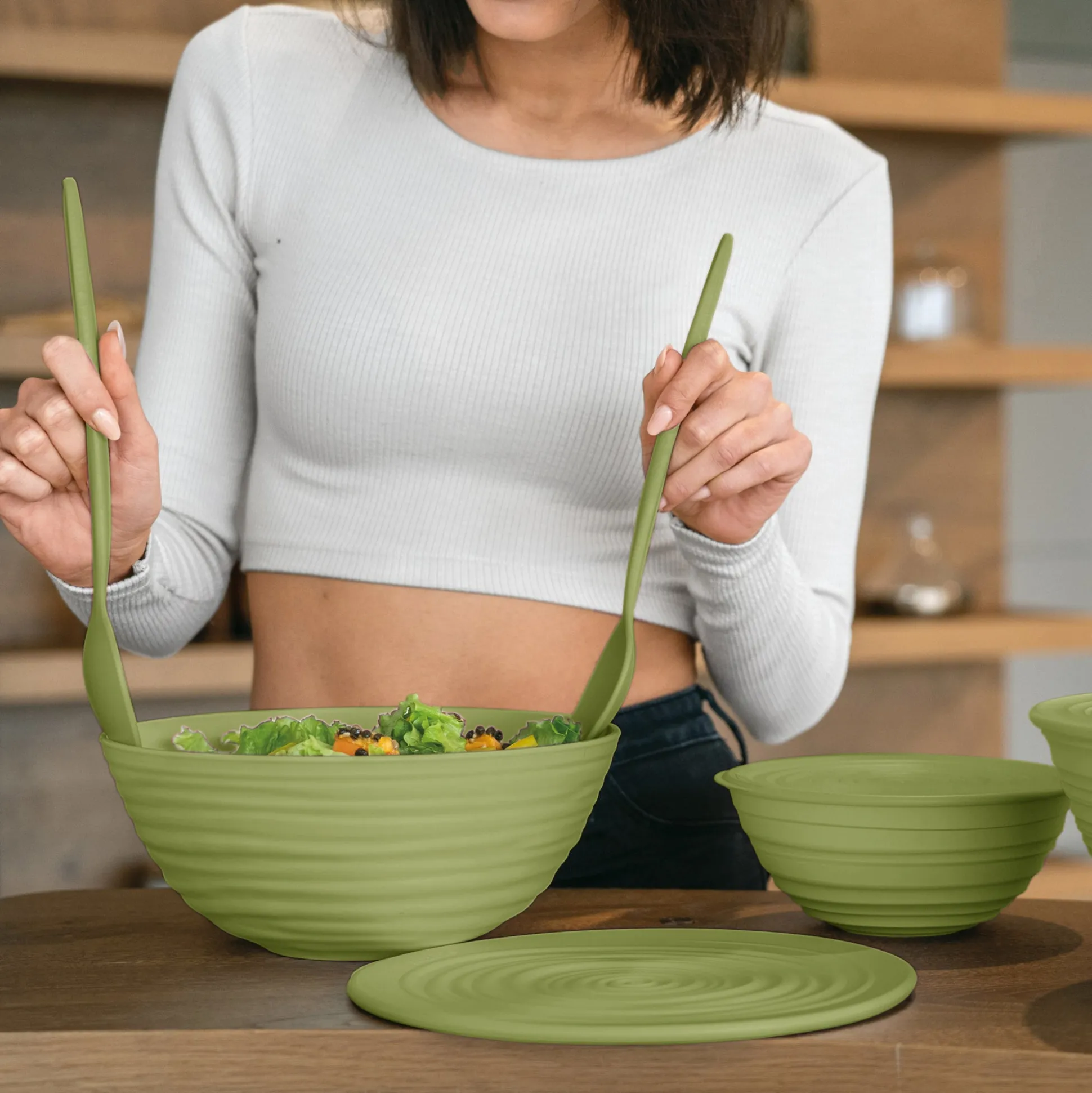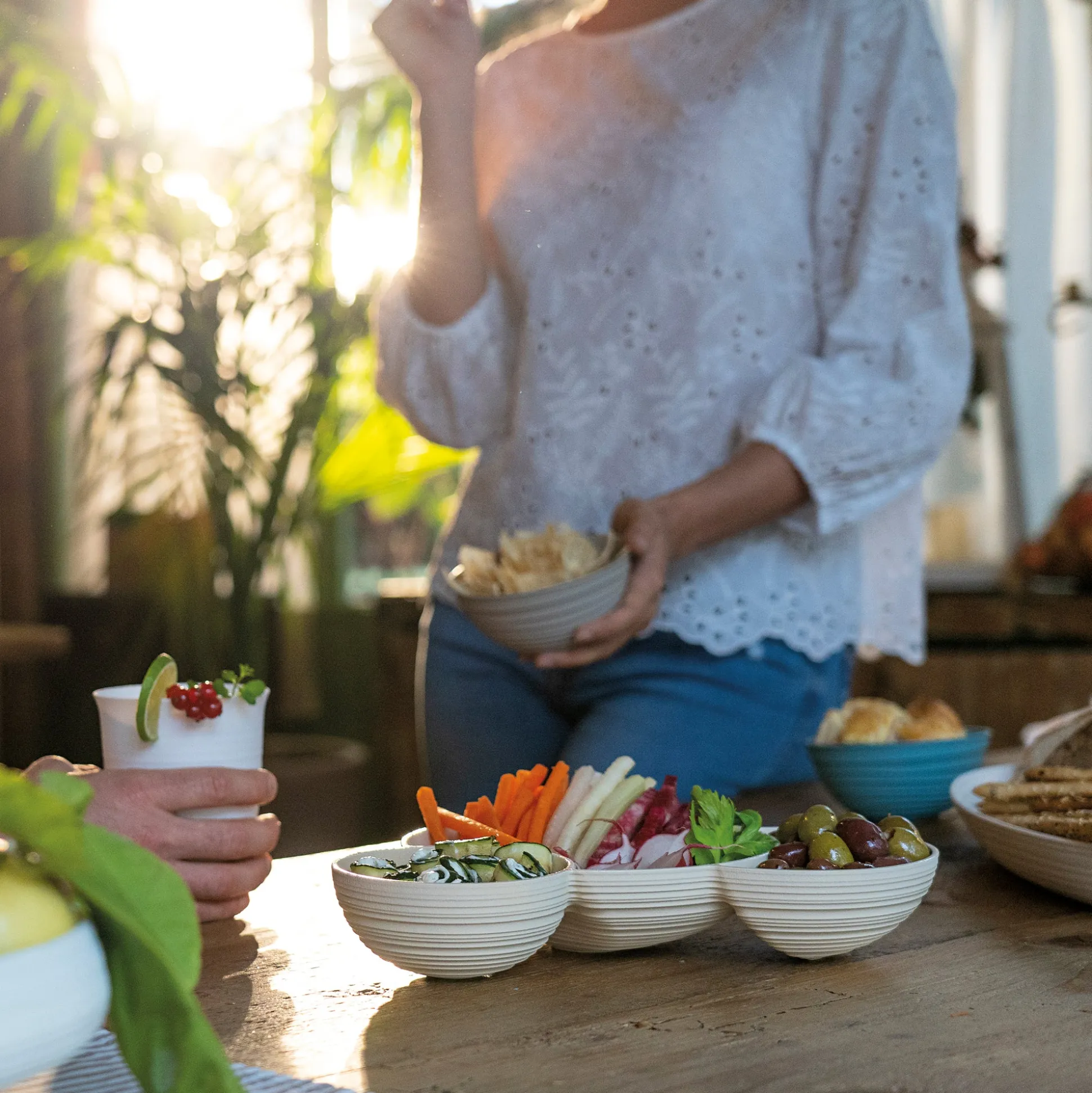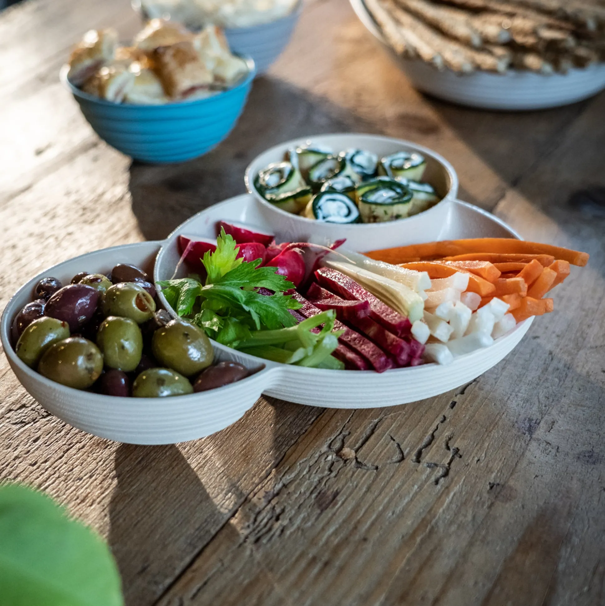 L’antipastiera è suddivisa in tre contenitori che possono ospitare dalle arachidi alle olive, dalle verdure fresche julienne a sfiziosi tocchetti di formaggio. Le forme sono sinuose e accattivanti, la funzionalità è garantita.