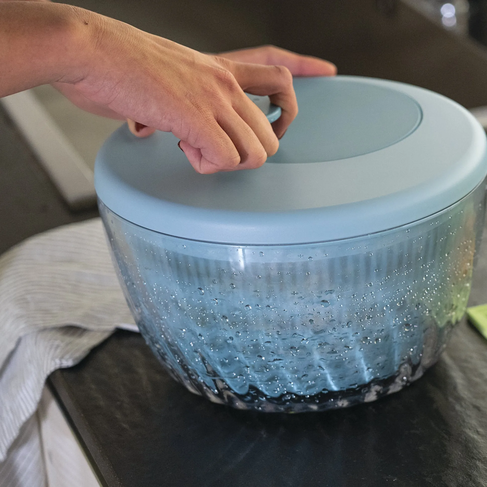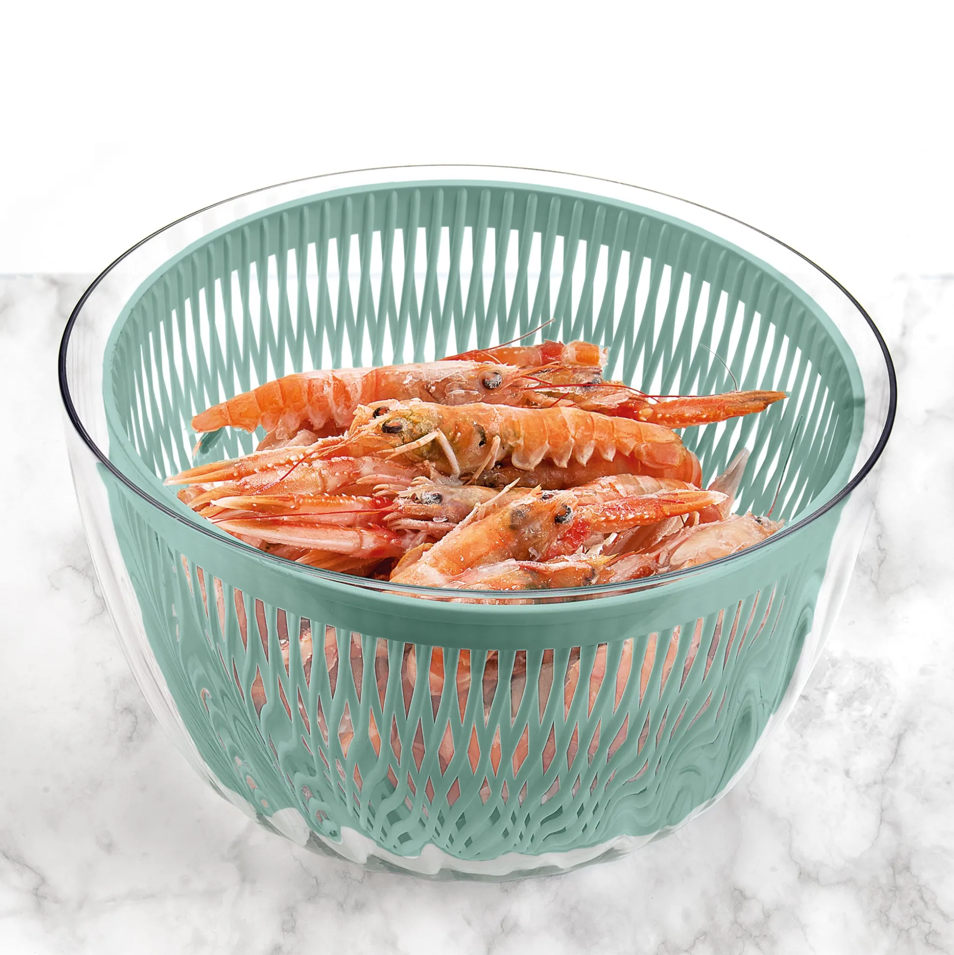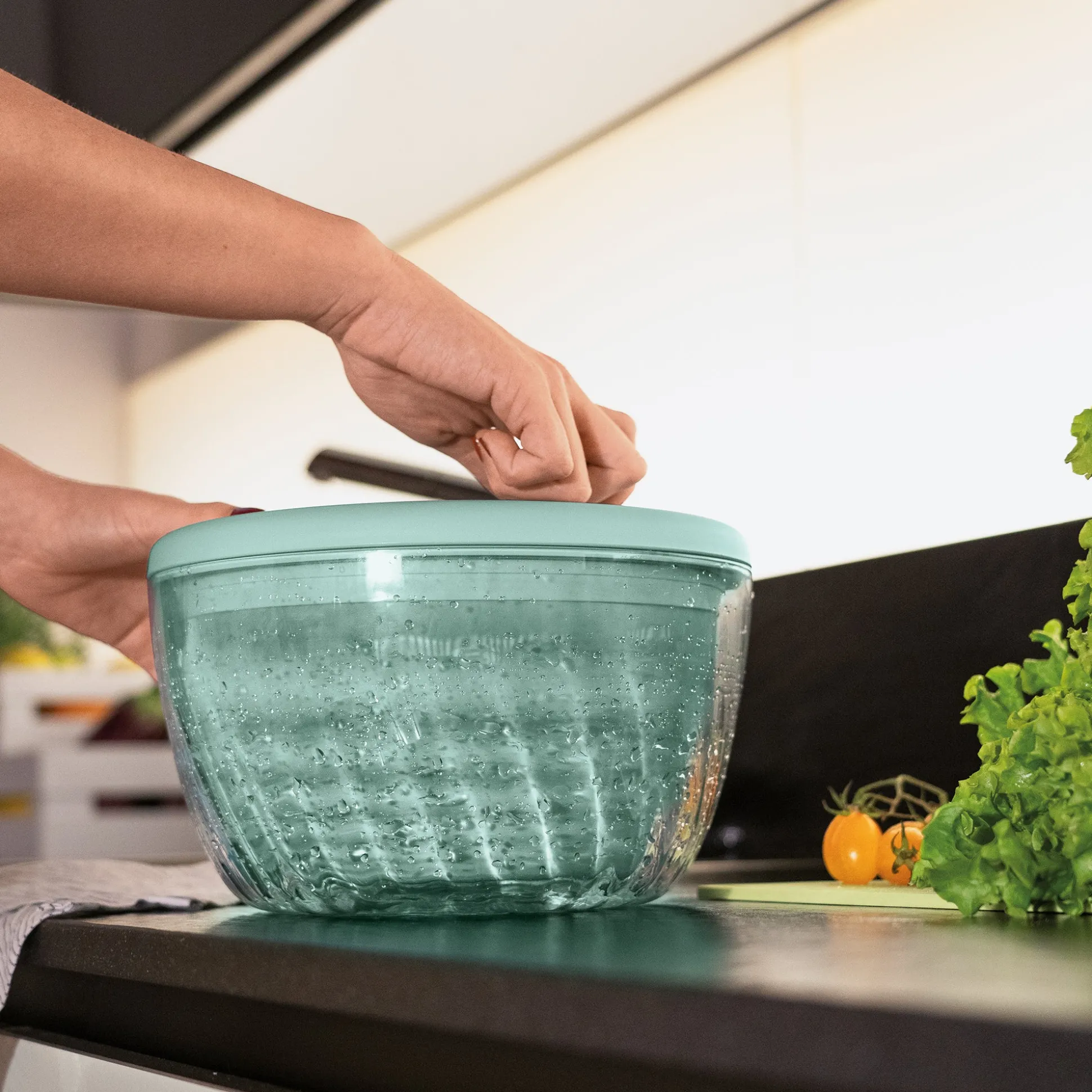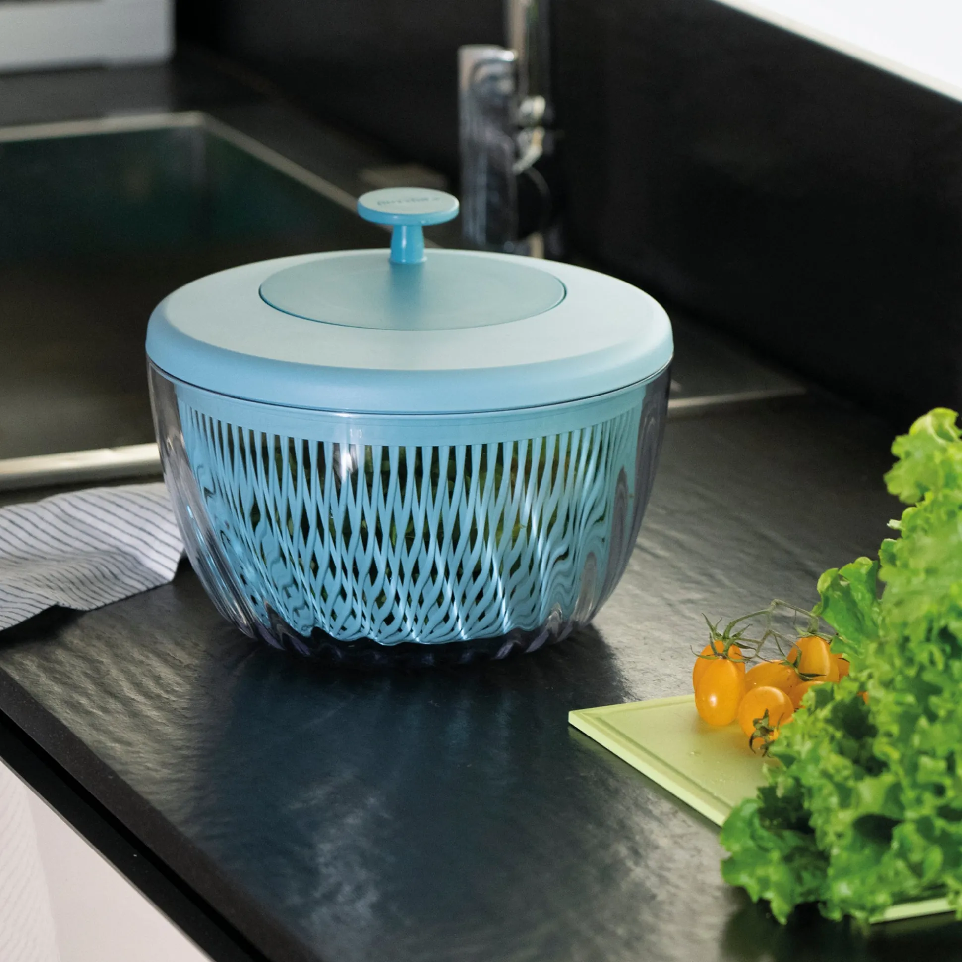 Centrifuga per insalata ‘Spin&Store’ lava e asciuga l’insalata e tutte le verdure a foglia grande in modo rapido ed efficace.