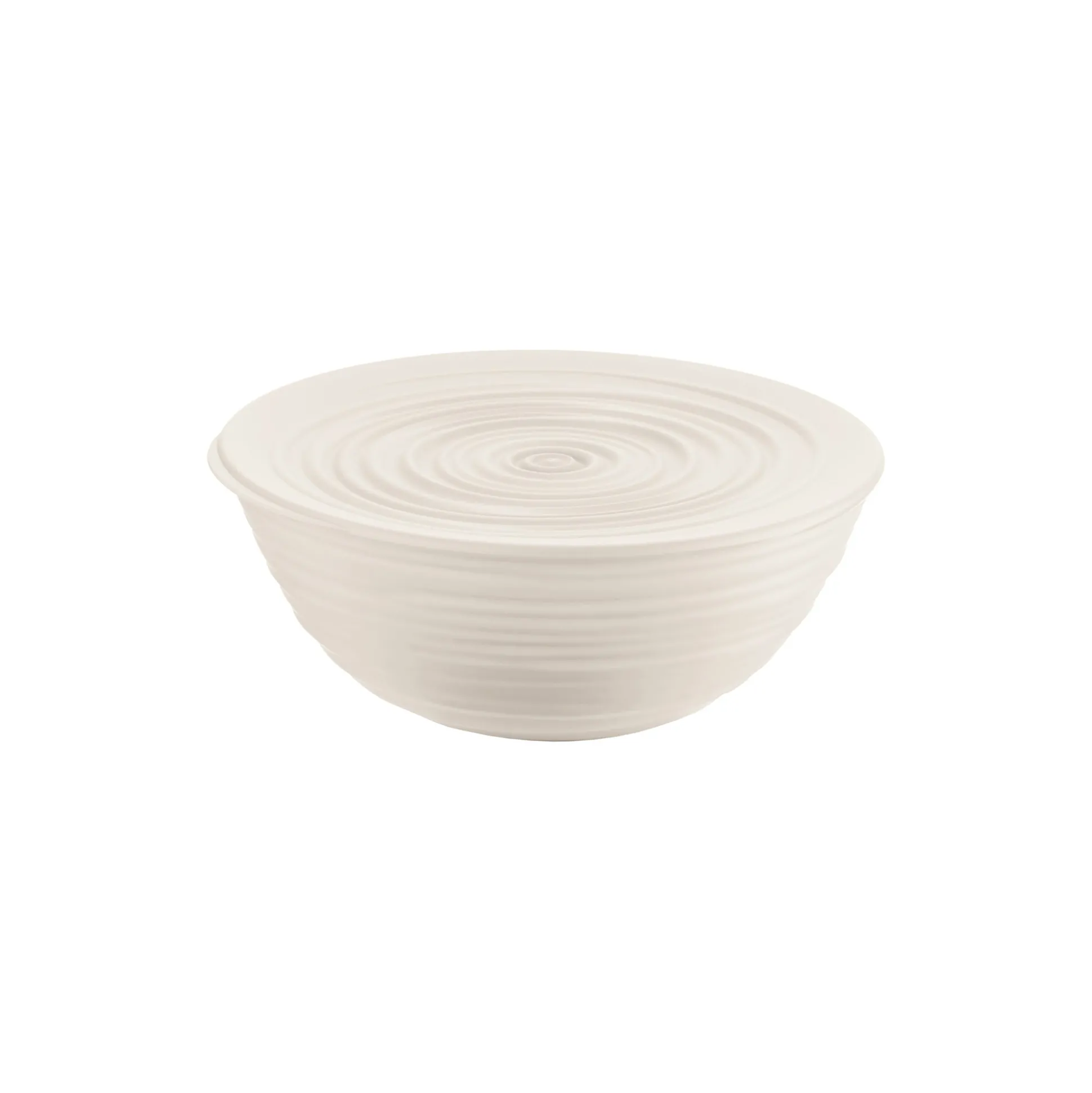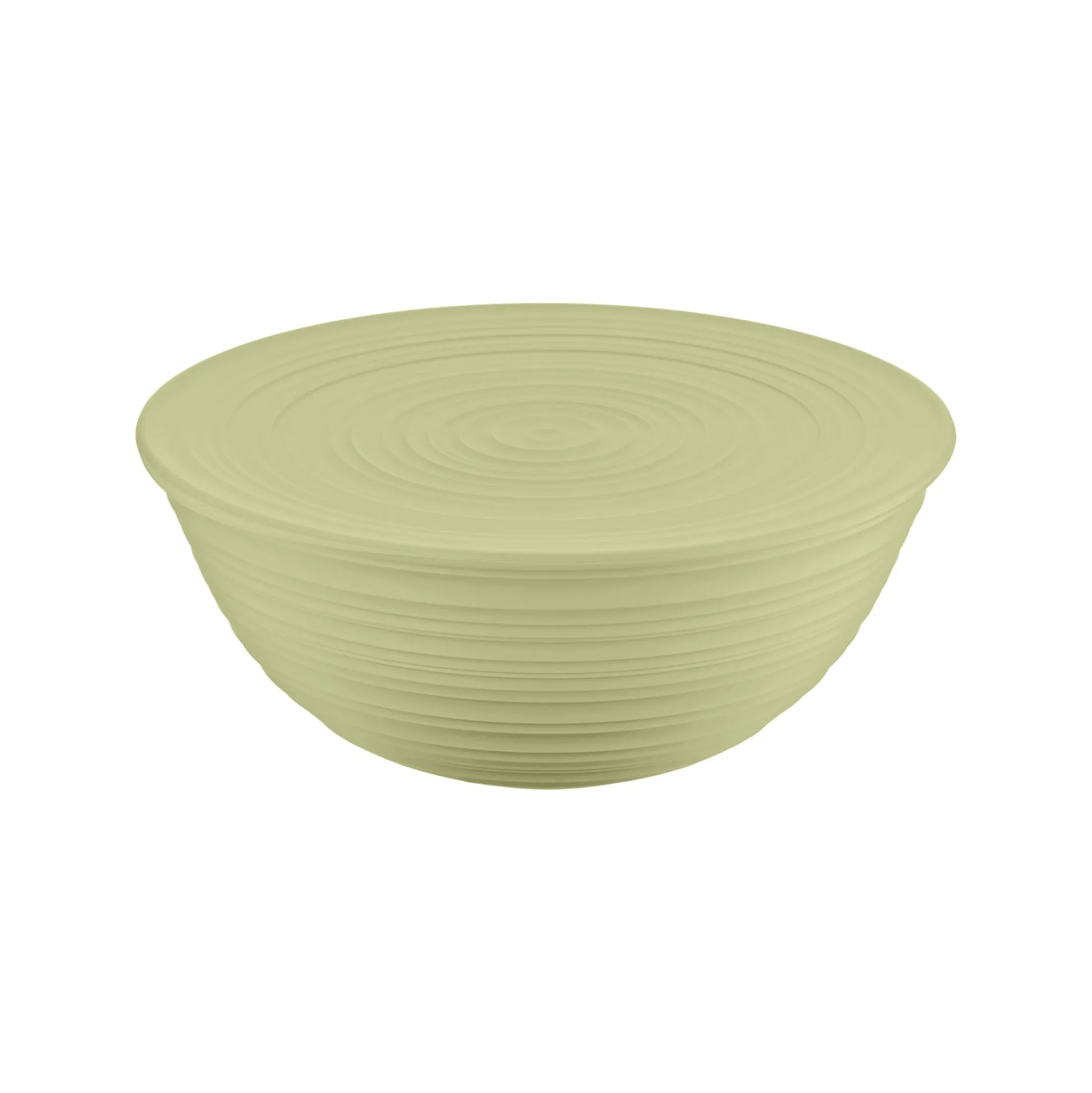 Contenitore con coperchio realizzato riciclando 15,6 bottiglie d’acqua usa e getta da post consumo. La circolarità del segno grafico, volutamente irregolare, conferisce un aspetto handmade davvero evocativo. Il coperchio lo rende perfetto per la conservazione in frigo.