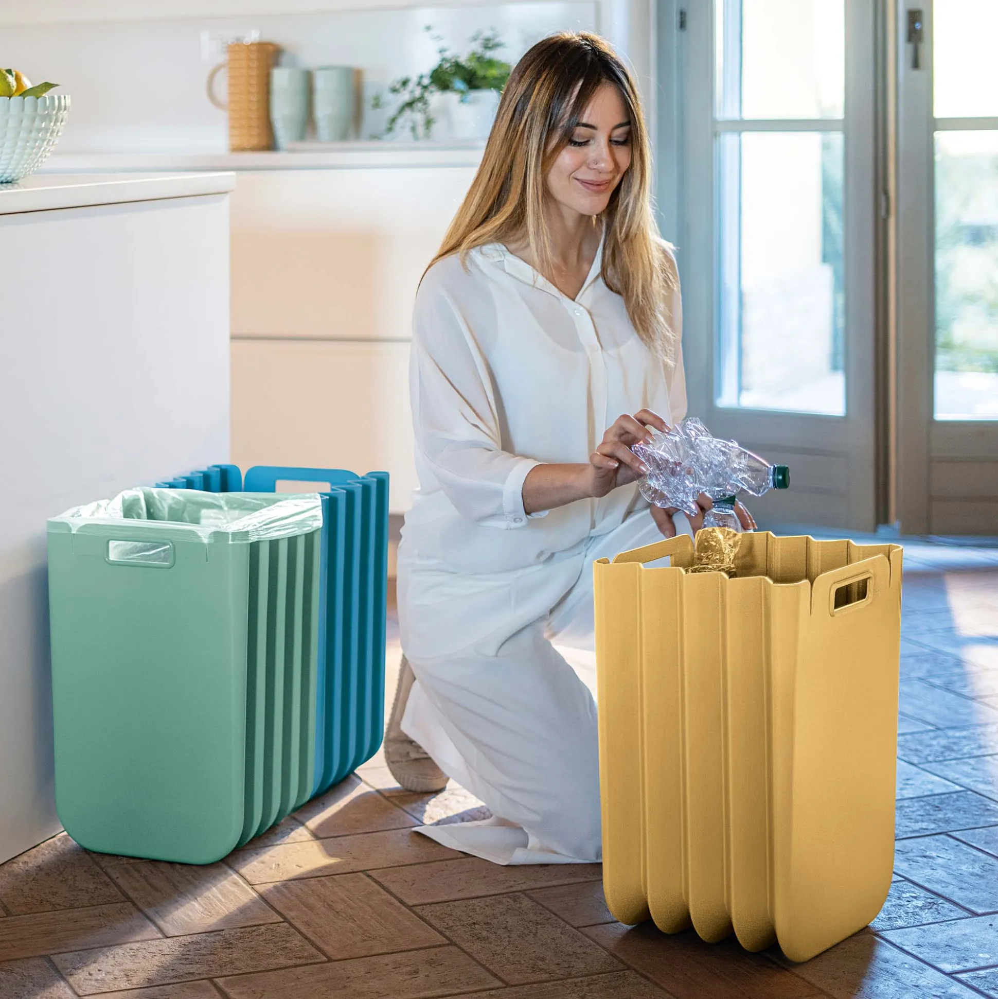EcoPackly, l’innovativa pattumiera salvaspazio grazie alla struttura pieghevole, è ideale per la raccolta differenziata in casa di carta, plastica, vetro, metalli.