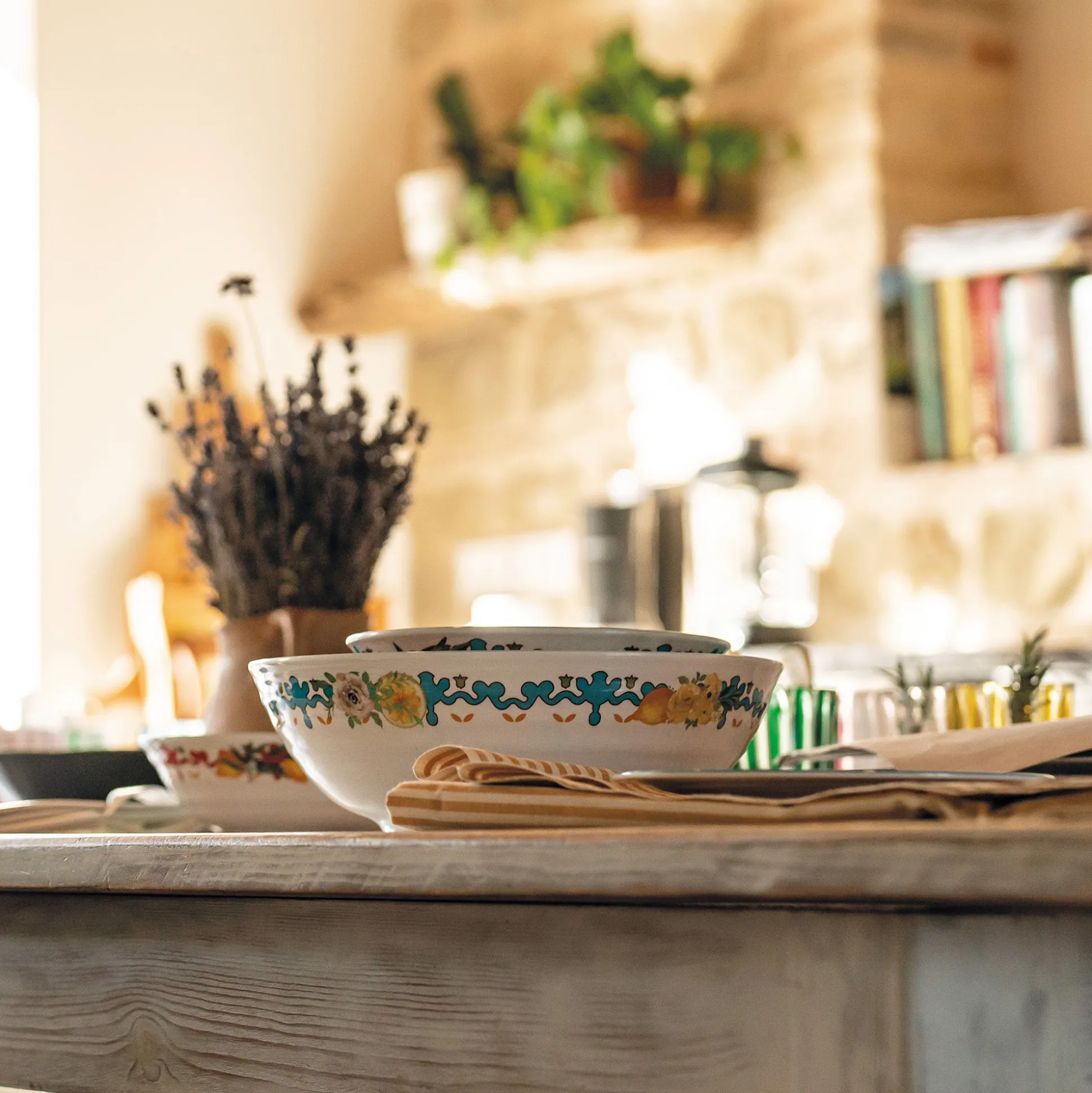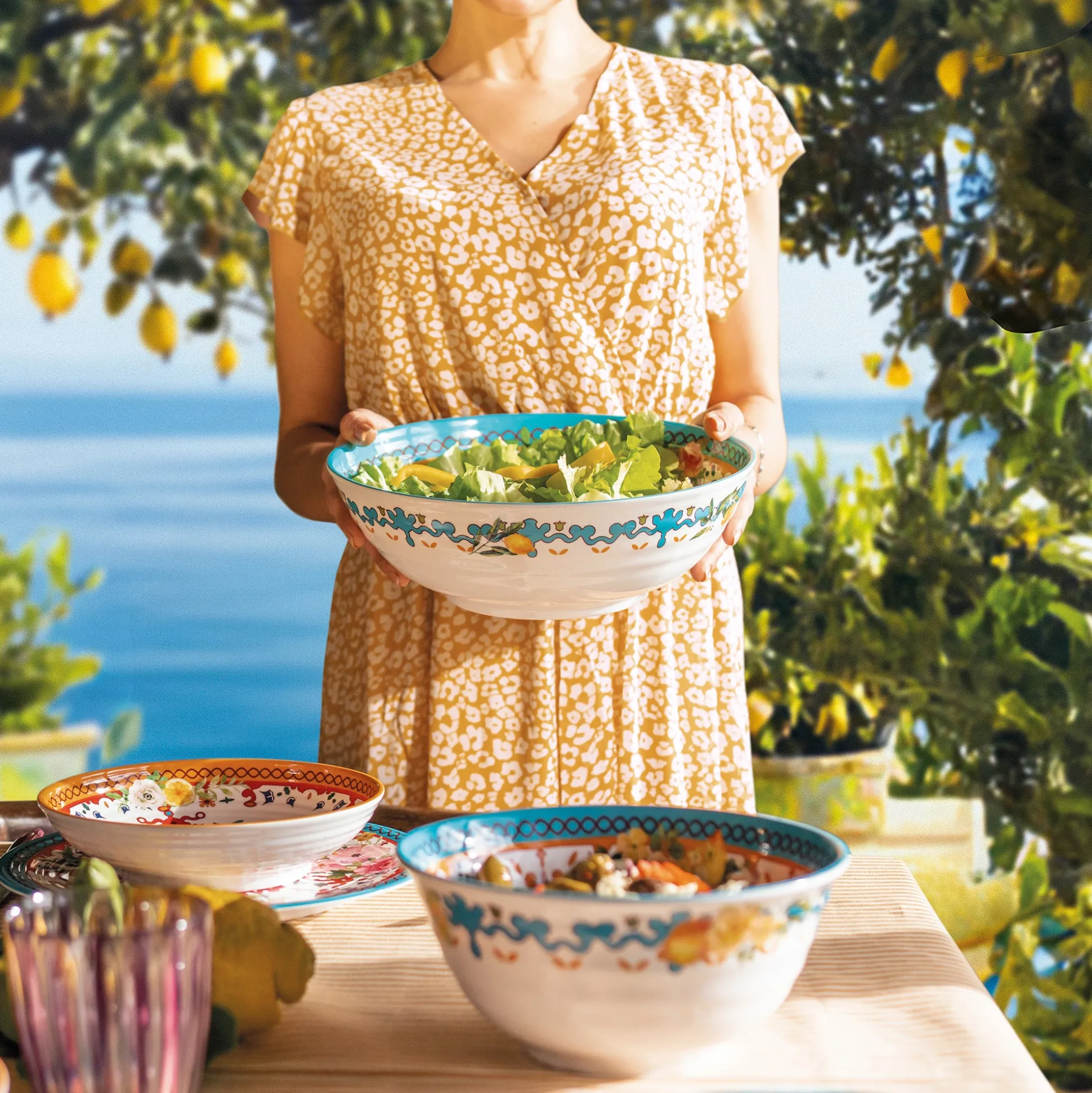 I contenitori in melamina ‘’Flower&Lemon’’ evocano i profumi e i colori dei fiori primaverili e dei limoni, regalando alla tavola un tocco di freschezza e allegria. Perfetti per una festa all’aperto, un brunch informale o un’occasione speciale.