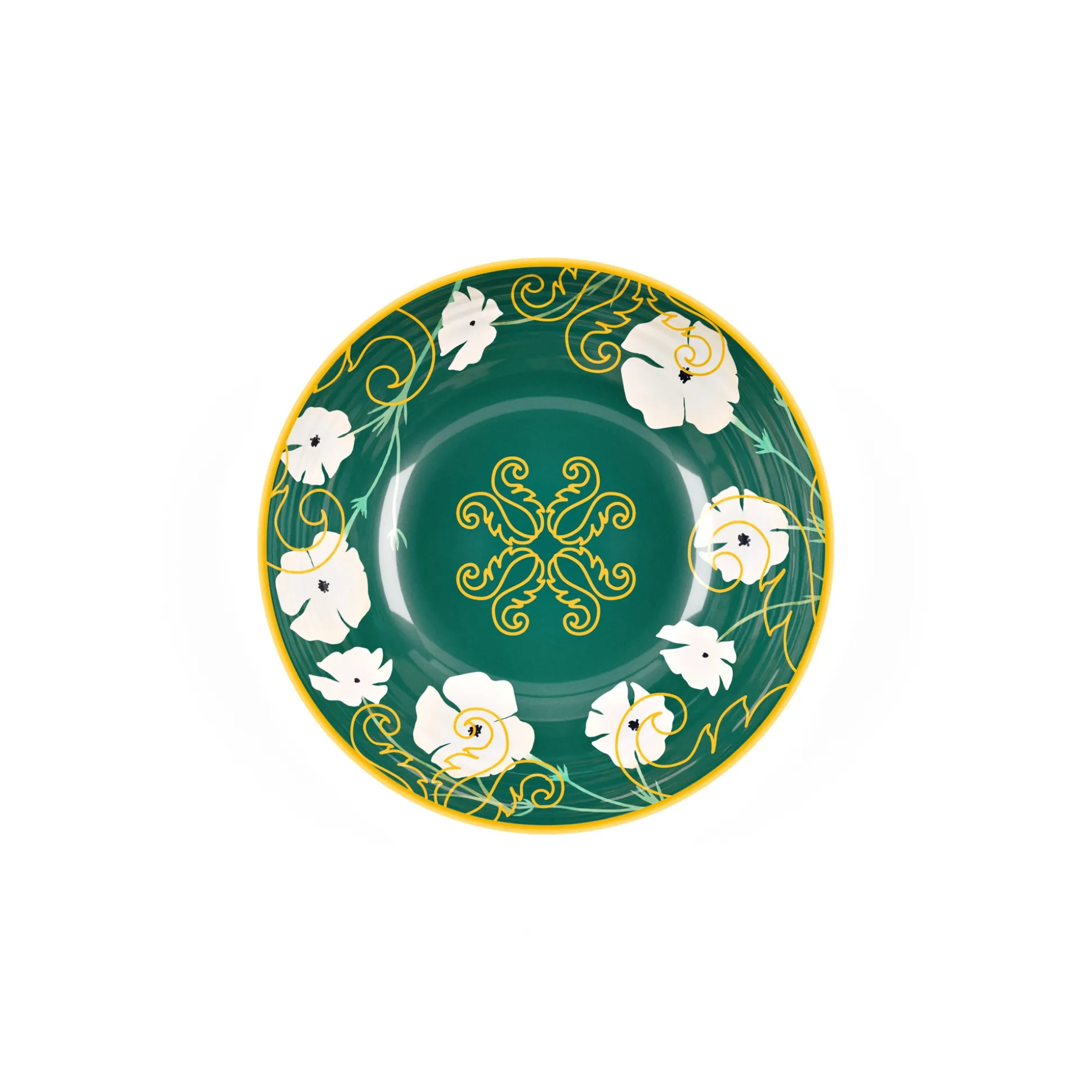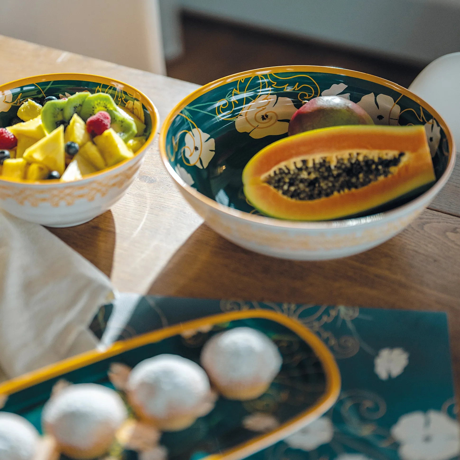 I contenitori in melamina ‘’Fusion’’ offrono un’originale combinazione di colori e stili. Il verde intenso abbinato al bianco dei fiori e all’oro dei segni grafici conferiscono un aspetto elegante, adatto ad ogni stagione e ad ogni occasione.