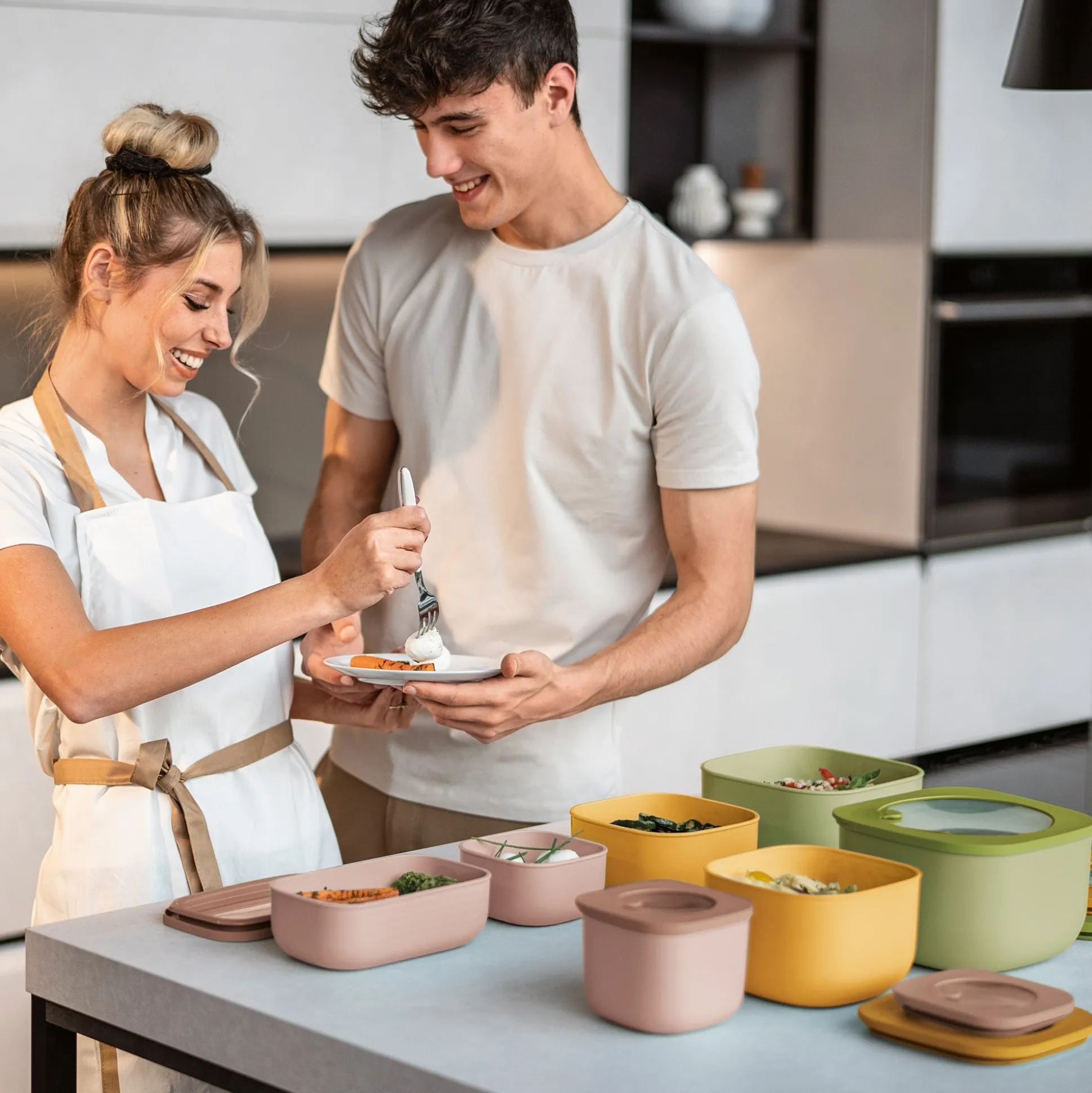 Contenitori ermetici con coperchio ideali per conservare in freezer o frigo, riscaldare in microonde senza togliere il coperchio, trasportare e servire cibo in casa o fuori casa. Impilabili e salvaspazio grazie alla forma quadrangolare. I contenitori senza coperchio sono realizzati in materiale plastico bio-based* derivato da scarti e residui di biomassa vegetale, quindi rinnovabile, di origine non fossile e 100% riciclabile.
