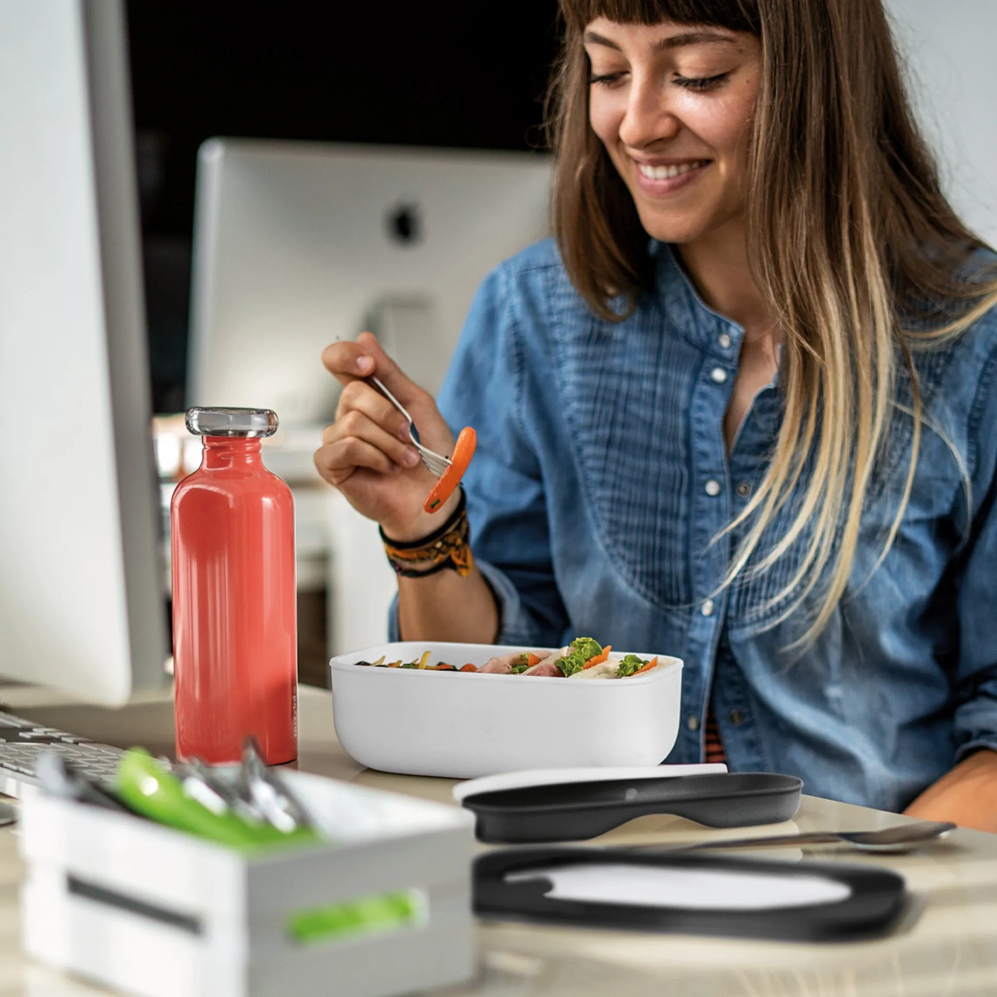 Lunch box con contenitore interno ideale per trasportare e servire cibo fuori casa. Decisamente pratico, utilizzabile in microonde con coperchio, lavabile in lavastoviglie e sicuro grazie al coperchio ermetico a doppia chiusura. Può contenere fino a 900 ml.