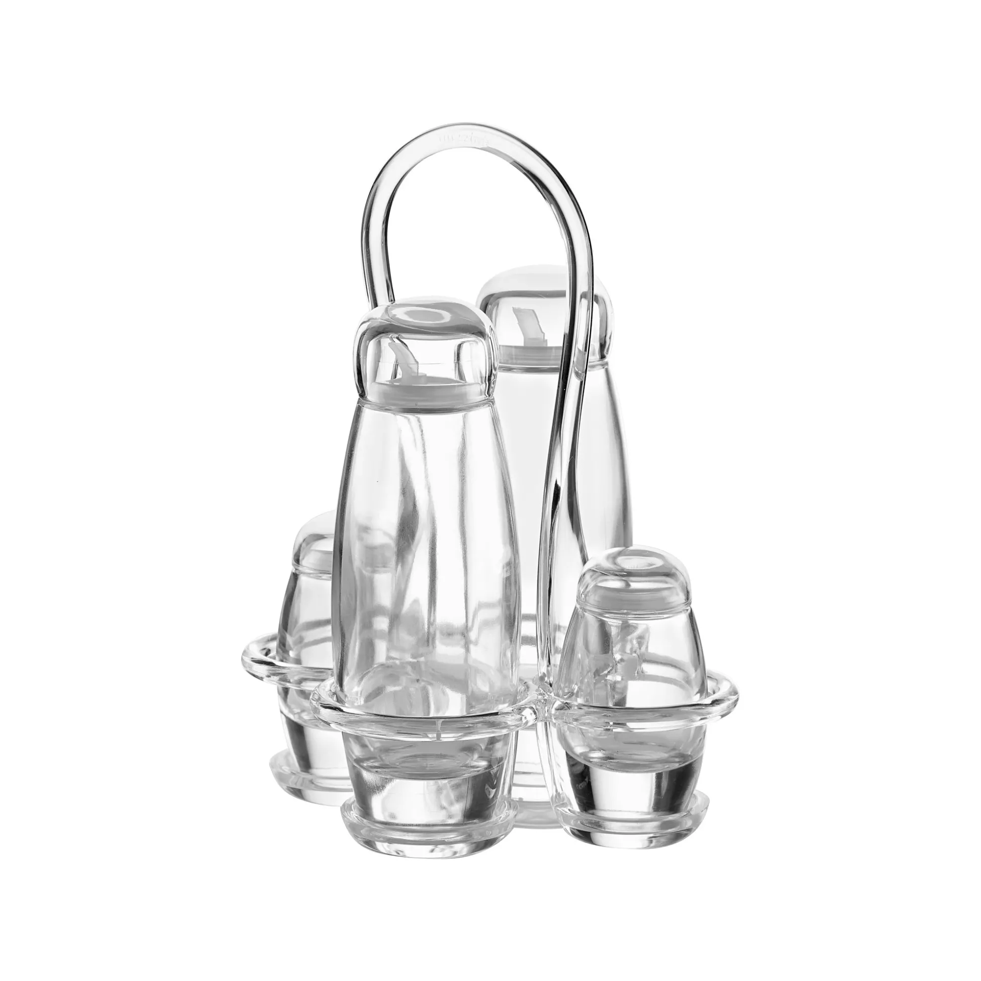 Un set olio aceto sale e pepe composta da ampolle in vetro, un dosatore tagliagoccia per olio/aceto, dei tappi in materiale plastico per preservare dalla polvere e dallo sporco. La comoda base permette di trasportare in sicurezza il prodotto, grazie alla larga maniglia.