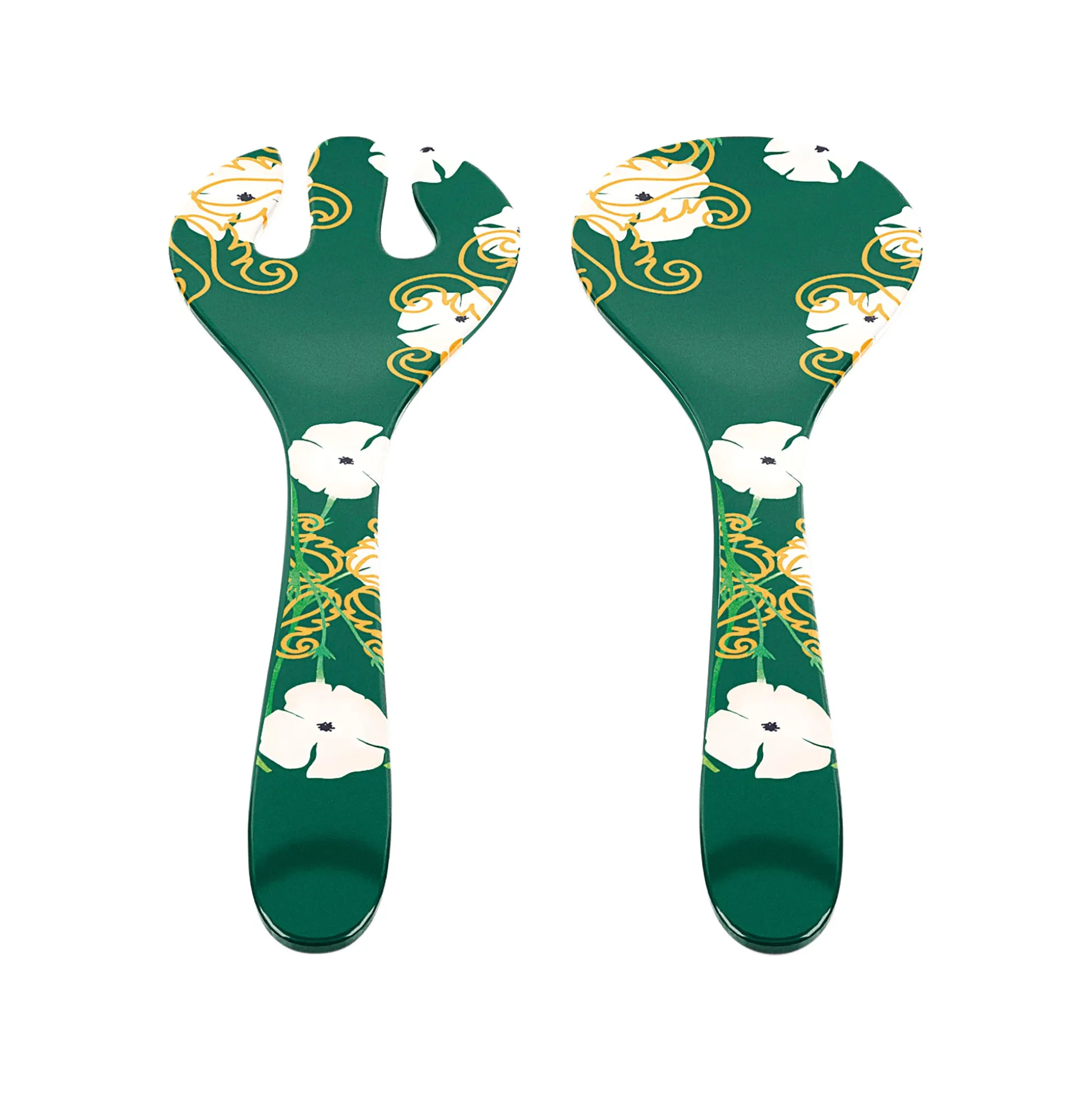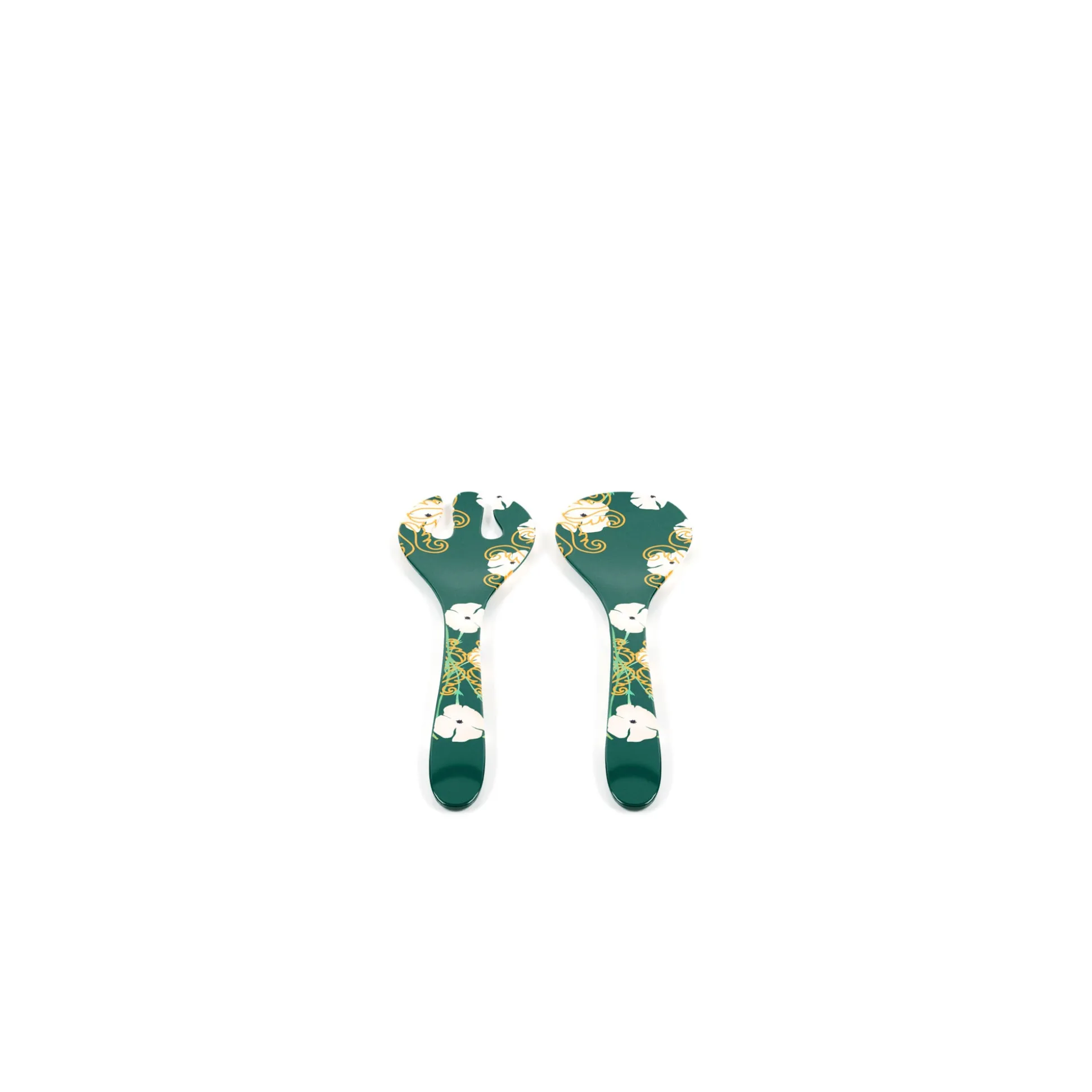 Le posate insalata in melamina ‘’Fusion’’ offrono un’originale combinazione di colori e stili. Il verde intenso abbinato al bianco dei fiori e all’oro dei segni grafici conferiscono un aspetto elegante, adatto ad ogni stagione e ad ogni occasione.