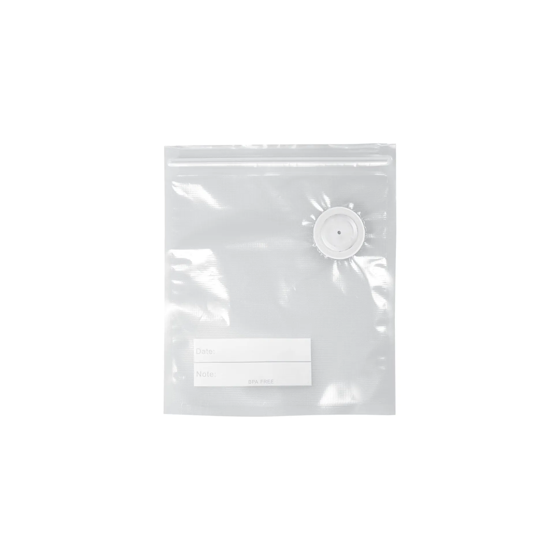 I sacchetti per la conservazione sottovuoto dispongono di una valvola per l’estrazione dell’aria e di un apposito spazio per scrivere la data di confezionamento del cibo contenuto.