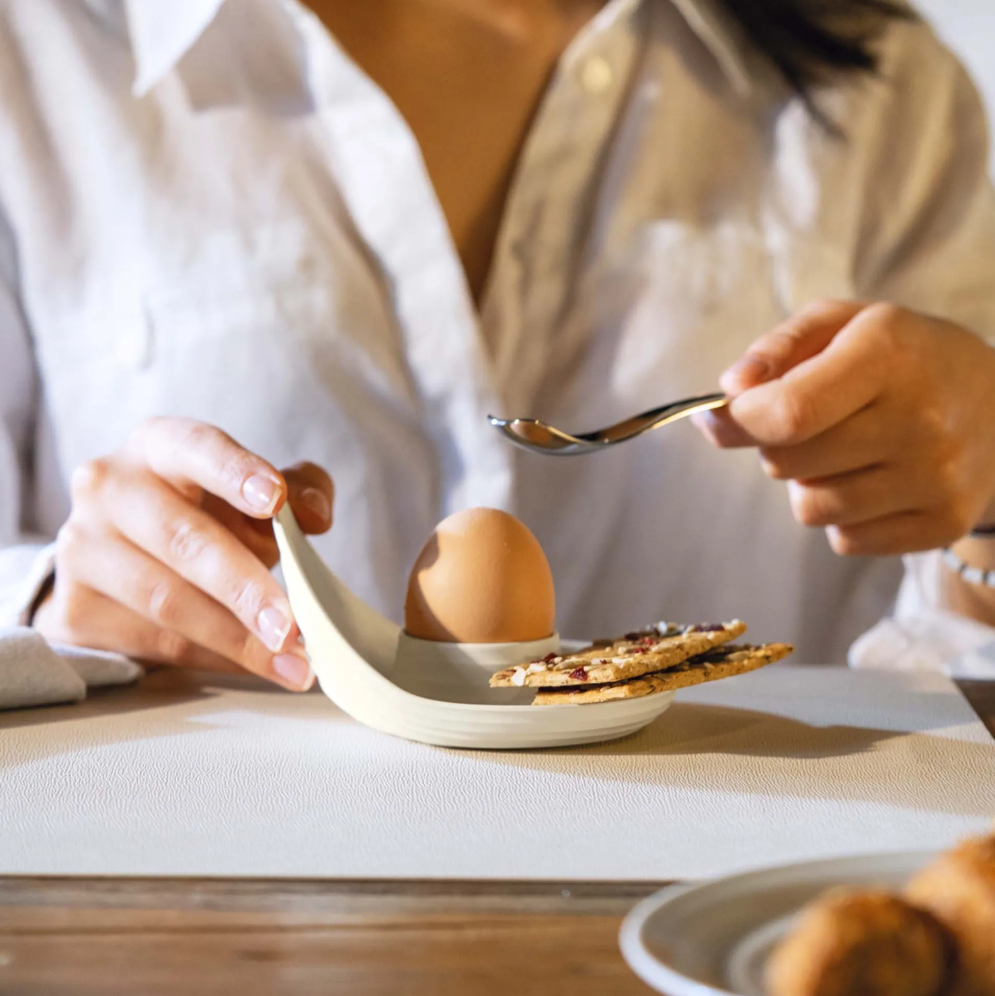 Un portauovo dalla forma contemporanea che non trascura la funzionalità. L’ala laterale, che è la particolarità della sua originale forma, serve anche per facilitare la presa del piattino stesso, mentre la base del portauovo può ospitare il cucchiaino e i pezzi di guscio. La sua impilabilità gli garantisce il plus di essere facile da riporre e salva-spazio.
