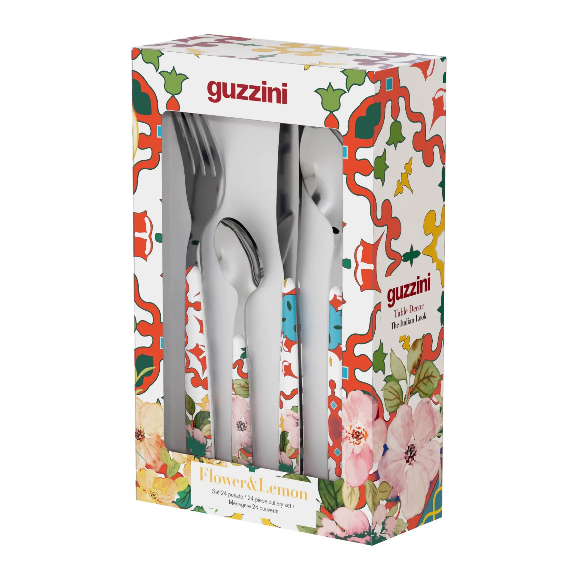 Le posate in acciaio con manico in plastica decorata ‘’Flower&Lemon” evocano i profumi e i colori dei fiori primaverili e dei limoni, regalando alla tavola un tocco di freschezza e allegria.