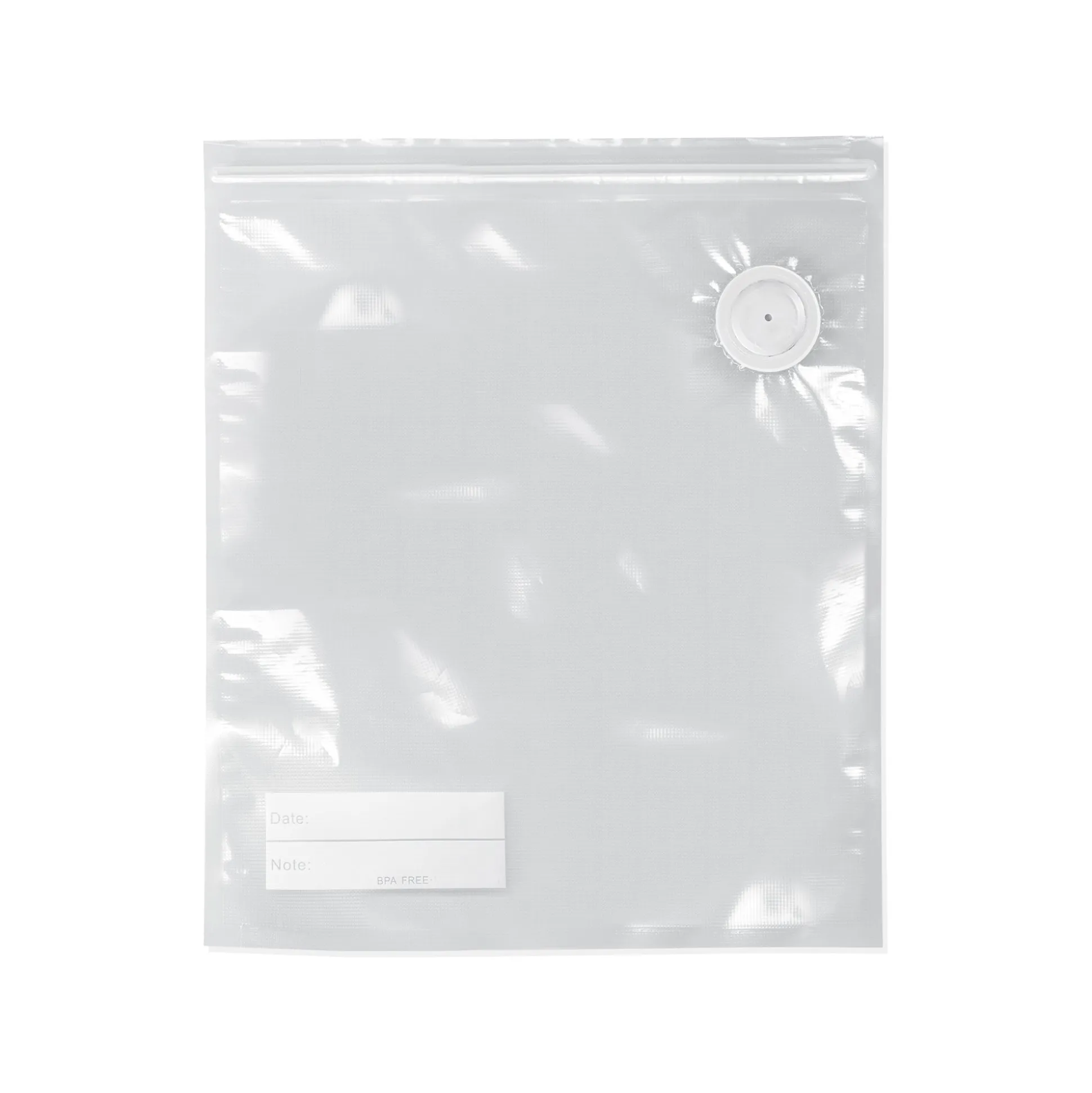 I sacchetti per la conservazione sottovuoto dispongono di una valvola per l’estrazione dell’aria e di un apposito spazio per scrivere la data di confezionamento del cibo contenuto.