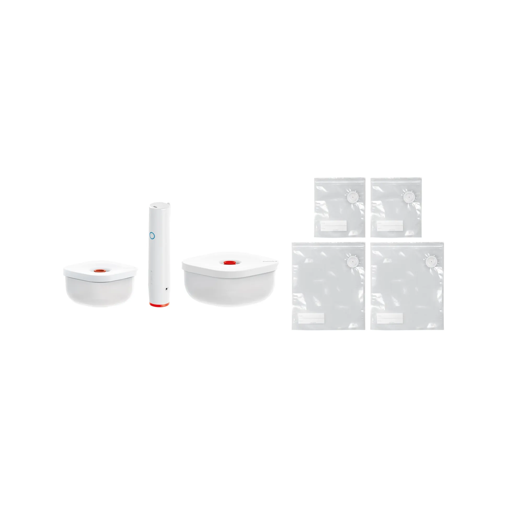 - 4 sacchetti riutilizzabili (2 piccoli e 2 grandi): con valvola per il sottovuoto, resistenti e utilizzabili in frigorifero, freezer e microonde.
