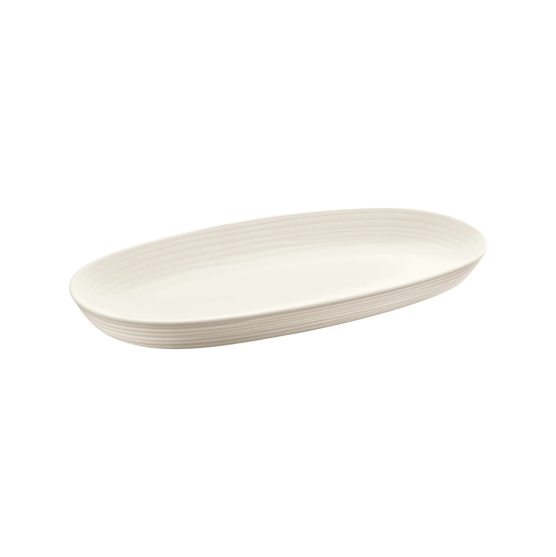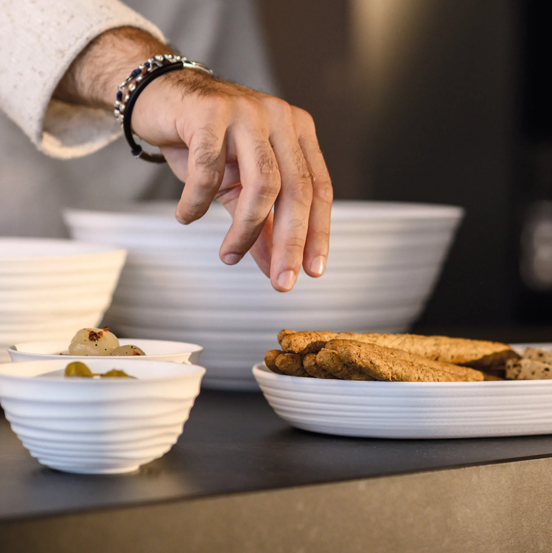 Vassoio da portata della collezione Tierra, interamente realizzato riciclando 13,5 bottiglie d’acqua in PET da post consumo, simbolo di una rivoluzione in tema di materialità e di stile. La circolarità del segno grafico, volutamente irregolare, conferisce un look handmade.