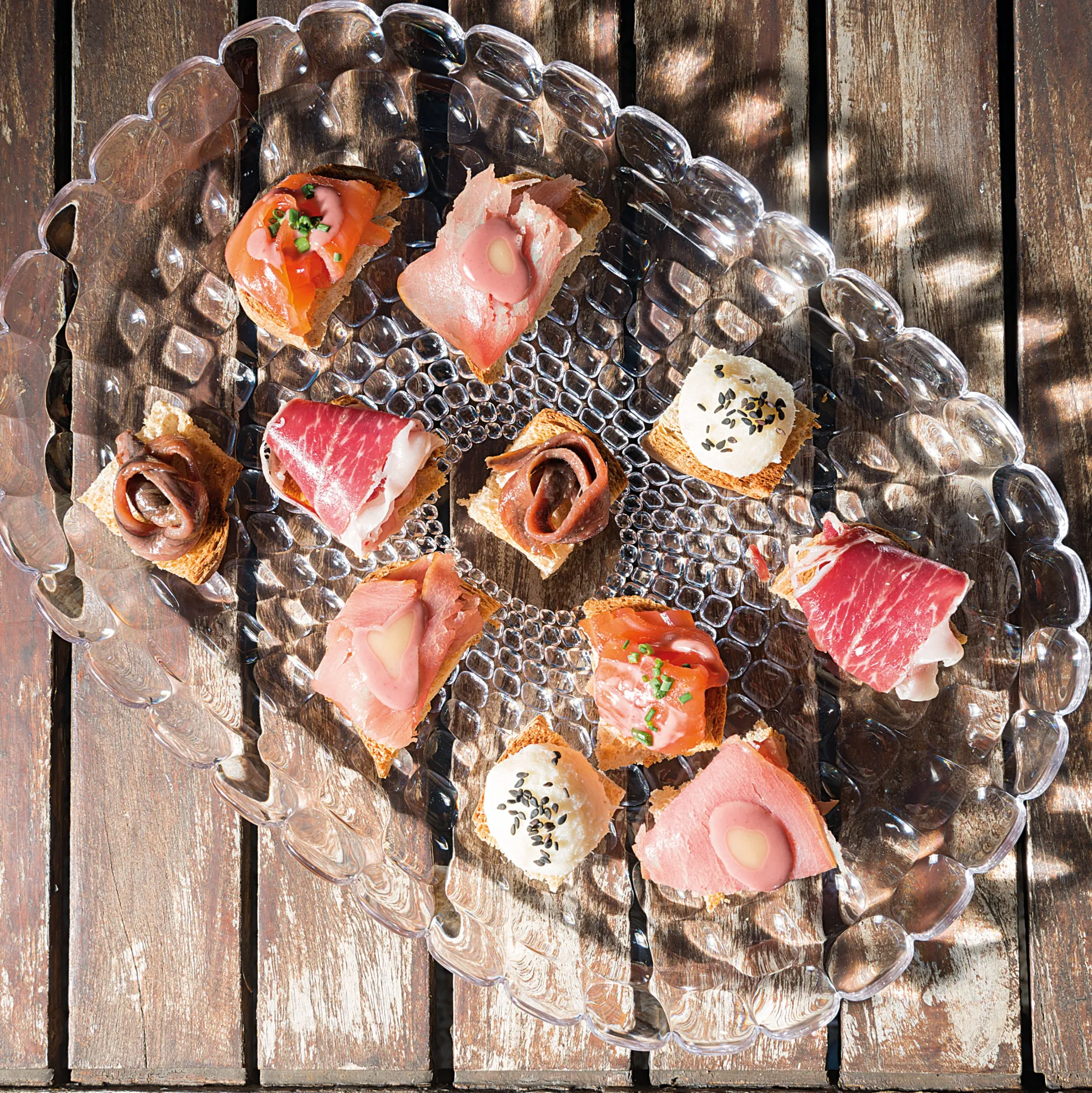 In pregiato materiale plastico trasparente e colorato dagli effetti scintillanti, Tiffany è perfetta per l’outdoor ma è capace di impreziosire anche le tavole più formali.