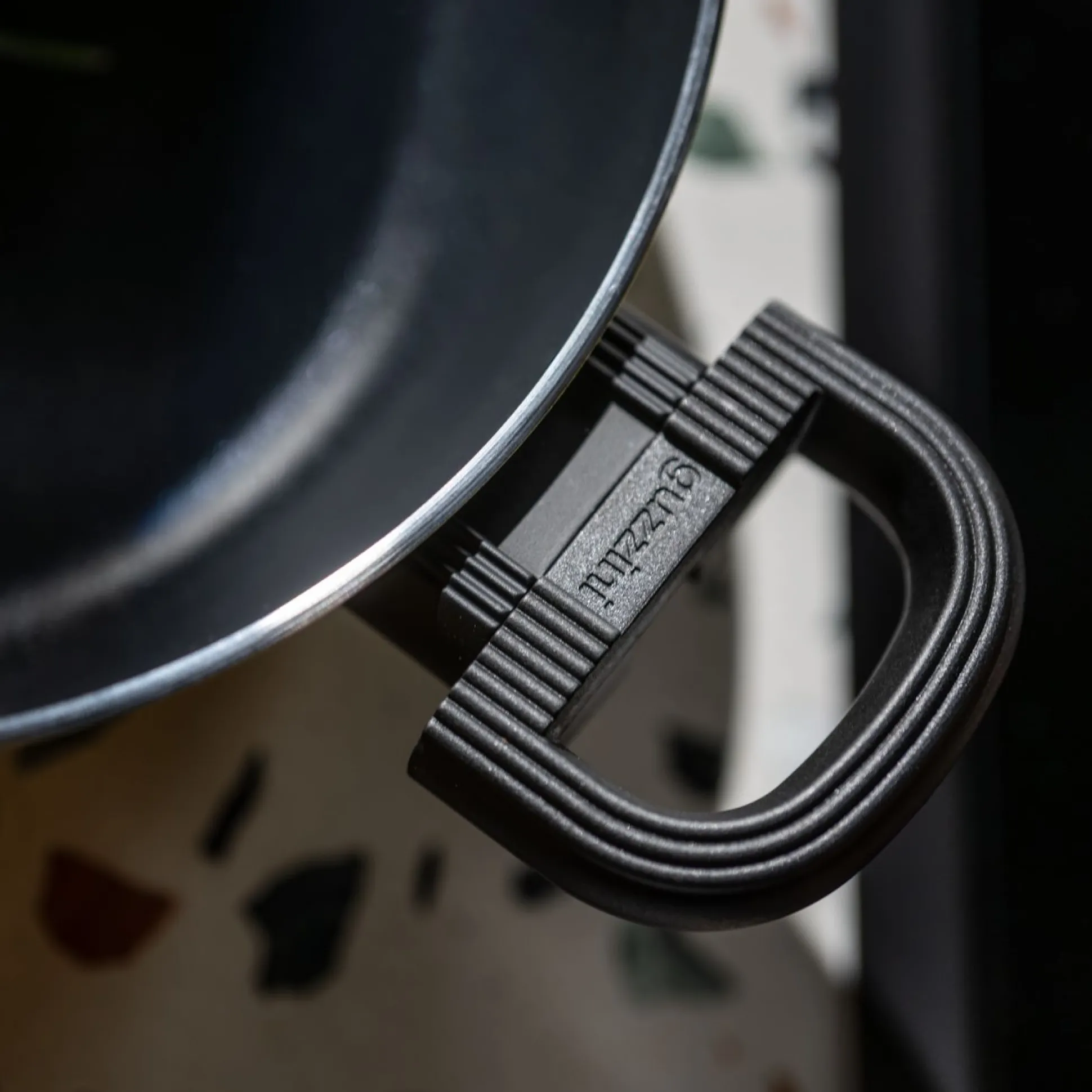 - I manici con foro d’aggancio si integrano perfettamente nei corpi delle pentole, mentre la decorazione a strisce diventa un elemento funzionale, dando maggiore ergonomicità e sicurezza per la presa.