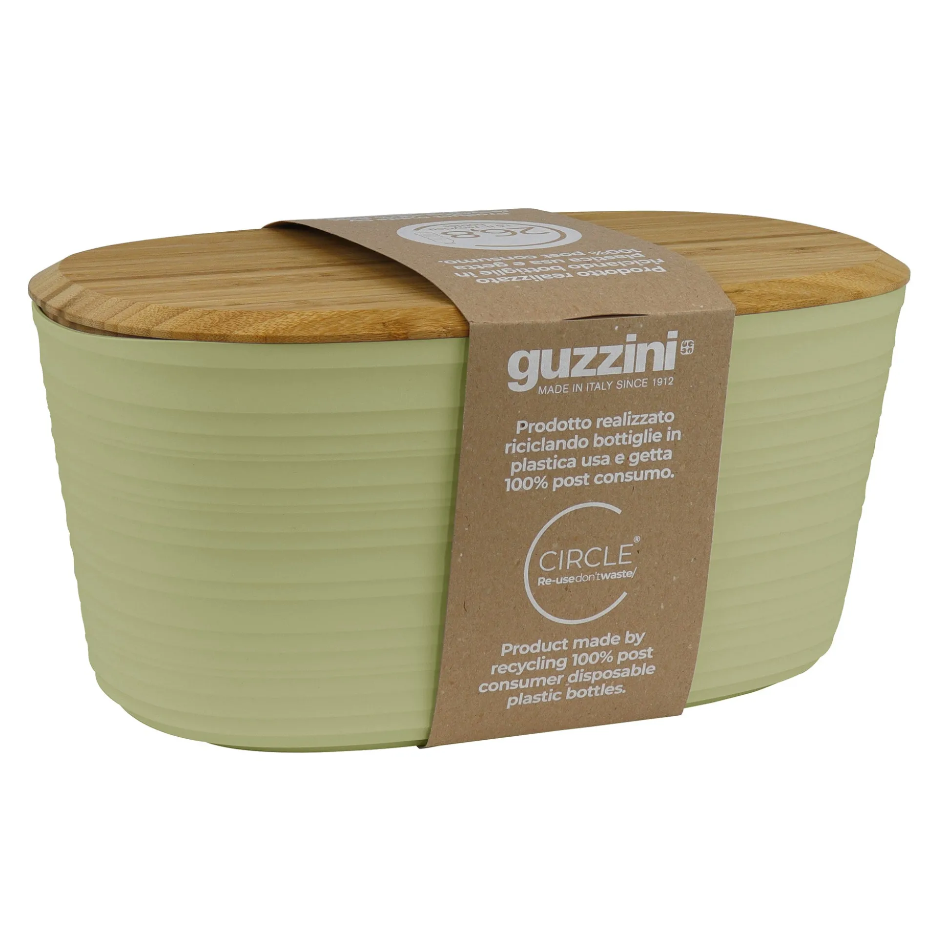 Cassetta pane realizzata riciclando 26,8 bottiglie d’acqua usa e getta 100% post consumo. Il coperchio è in legno di bamboo. La versatilità dell’oggetto lo rende anche un ottimo organizzatore da cucina.