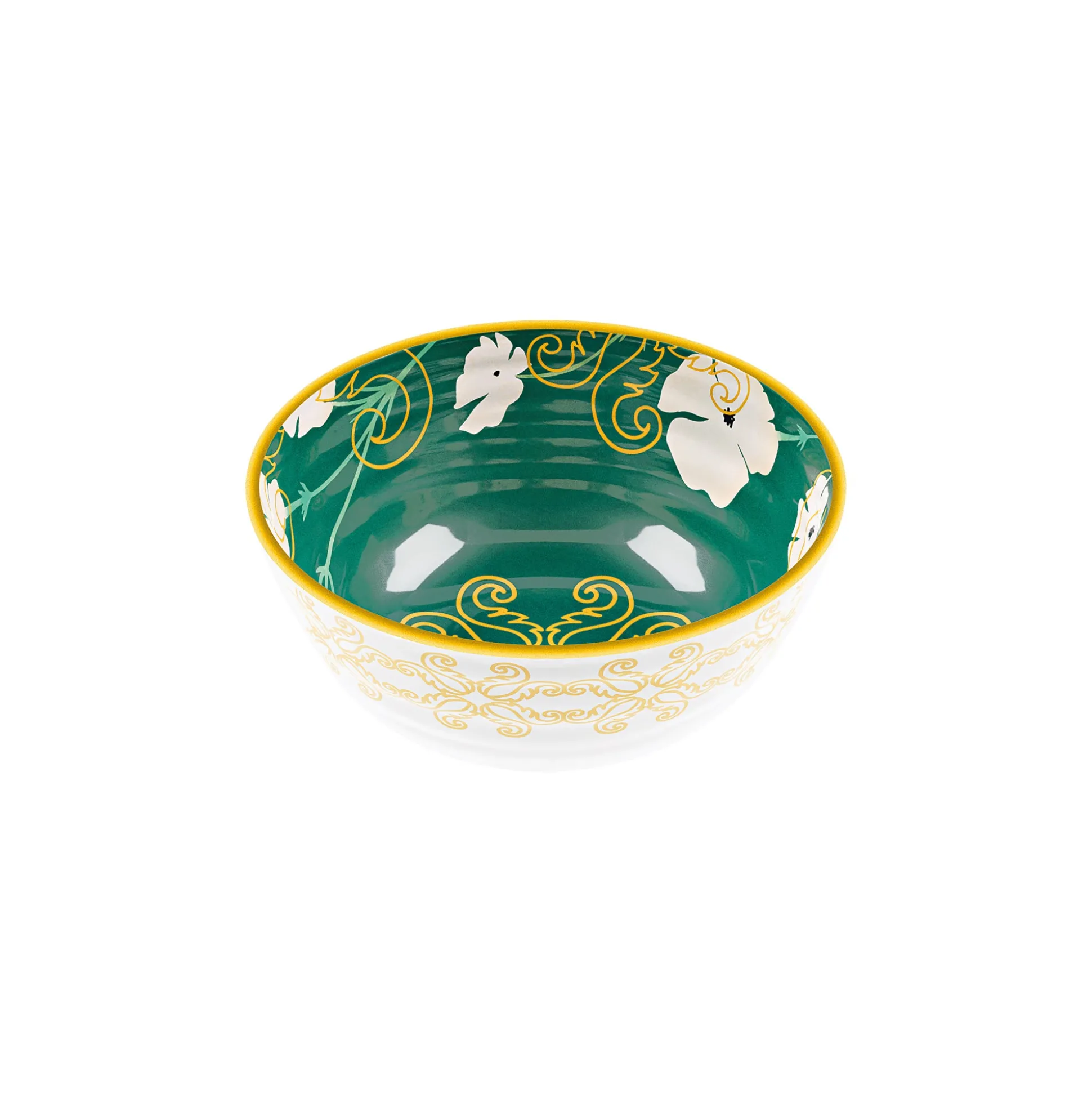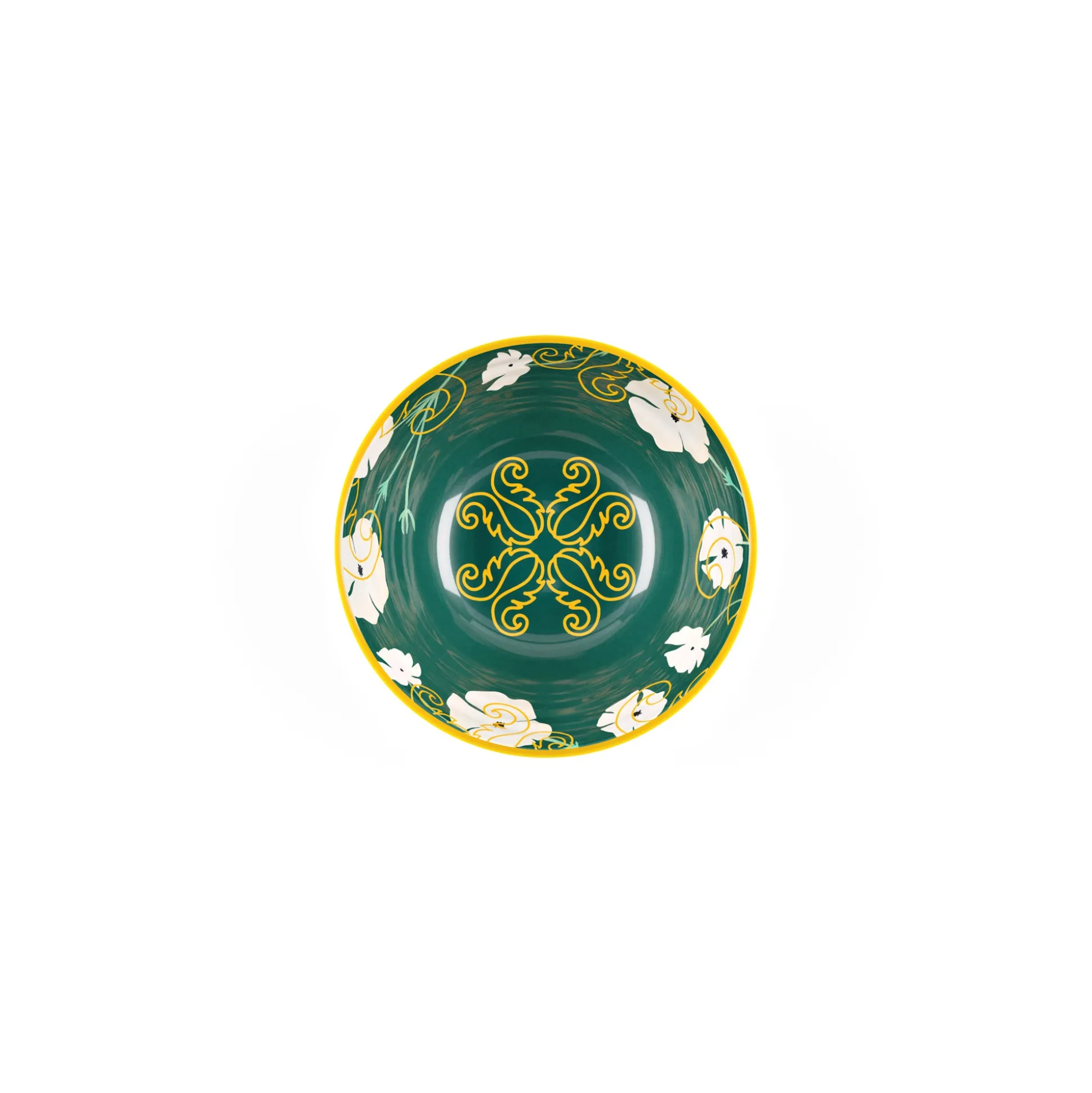 I contenitori in melamina ‘’Fusion’’ offrono un’originale combinazione di colori e stili. Il verde intenso abbinato al bianco dei fiori e all’oro dei segni grafici conferiscono un aspetto elegante, adatto ad ogni stagione e ad ogni occasione.