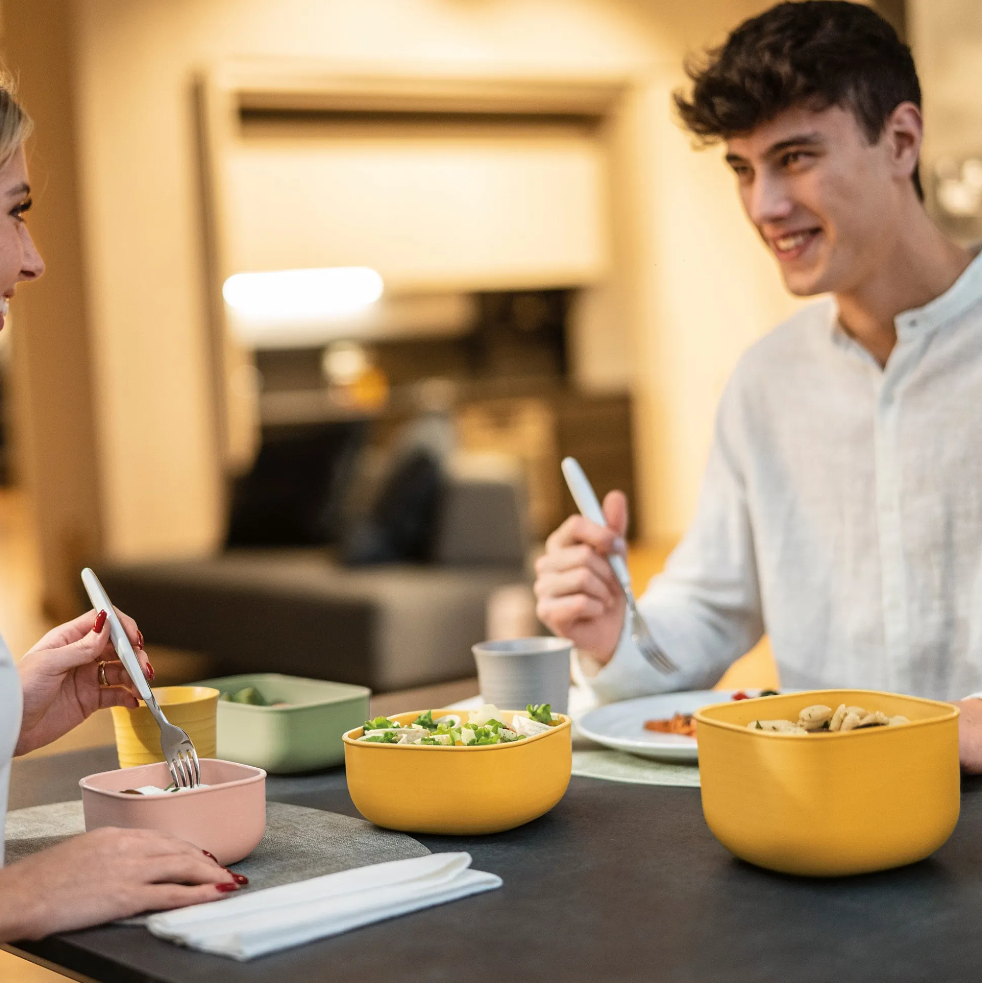Contenitori ermetici con coperchio ideali per conservare in freezer o frigo, riscaldare in microonde senza togliere il coperchio, trasportare e servire cibo in casa o fuori casa. Impilabili e salvaspazio grazie alla forma quadrangolare. I contenitori senza coperchio sono realizzati in materiale plastico bio-based* derivato da scarti e residui di biomassa vegetale, quindi rinnovabile, di origine non fossile e 100% riciclabile.