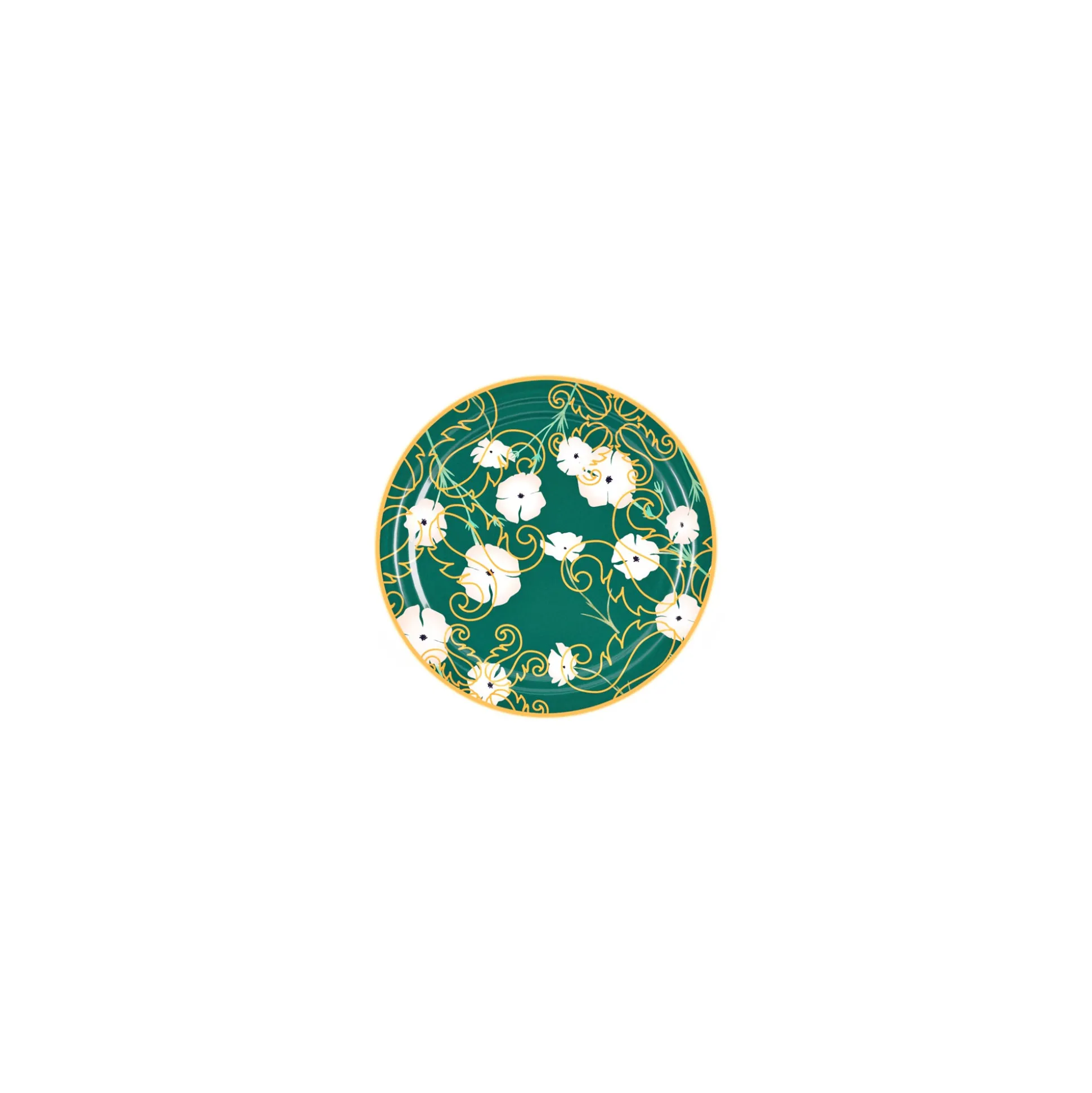 I piatti in melamina ‘’Fusion’’ offrono un’originale combinazione di colori e stili. Il verde intenso abbinato al bianco dei fiori e all’oro dei segni grafici conferiscono un aspetto elegante, adatto ad ogni stagione e ad ogni occasione.