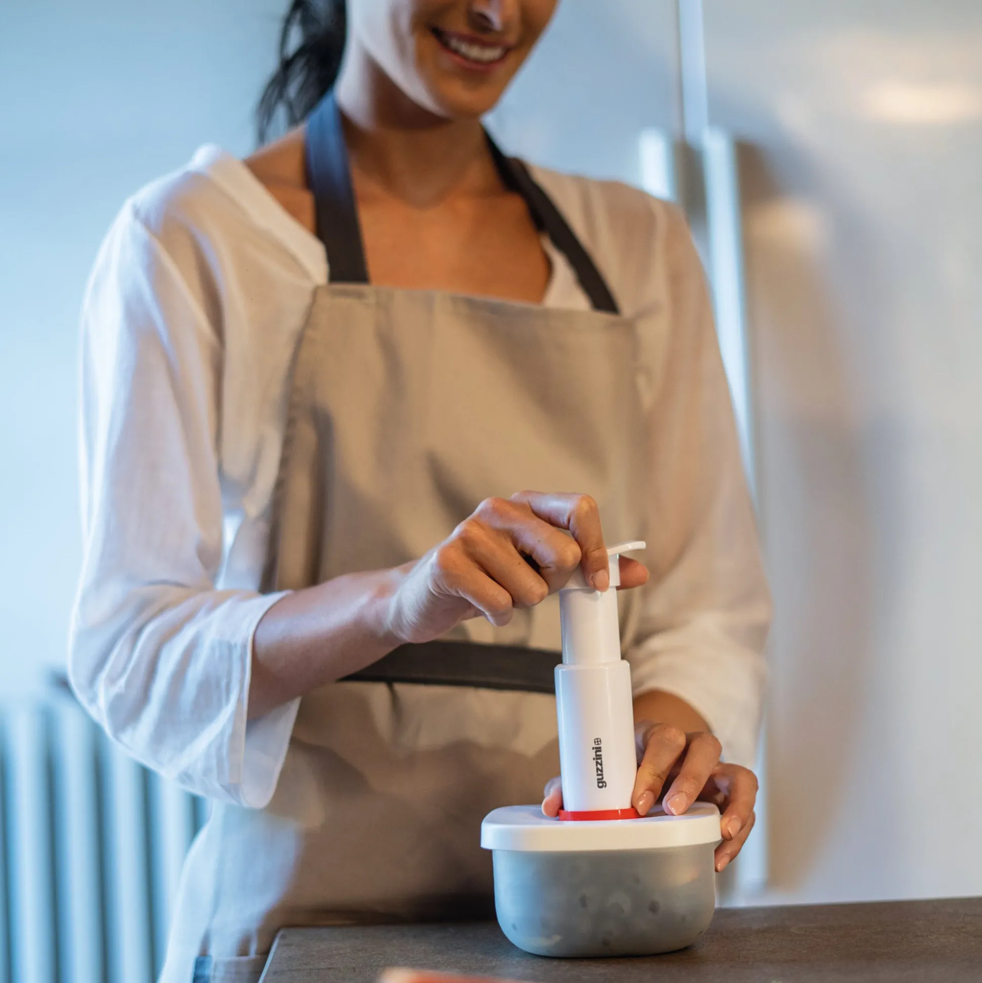La pompa manuale permette di creare il sottovuoto in sacchetti e contenitori in pochi secondi, in casa o fuori casa. Piccola e leggera è riponibile nel cassetto delle posate, in borsa o in valigia.