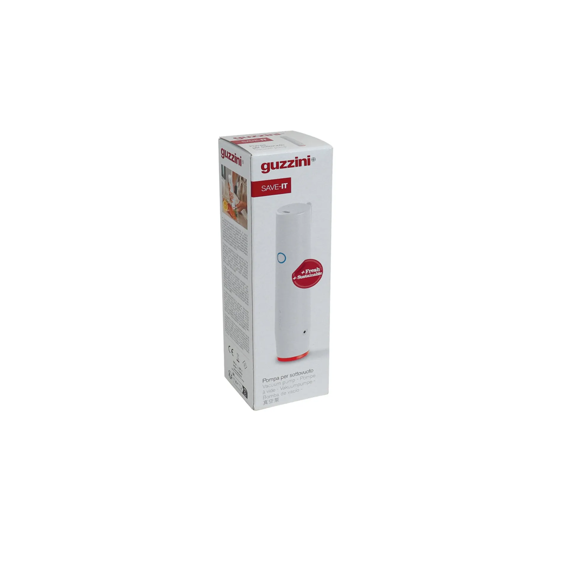 La pompa per il sottovuoto si ricarica come un device tramite cavo USB e ci avverte, con un segnale luminoso, quando la batteria è scarica. La pompa permette di creare il sottovuoto in sacchetti e contenitori in pochi secondi con la semplice pressione di un tasto e si arresta automaticamente a obiettivo raggiunto.