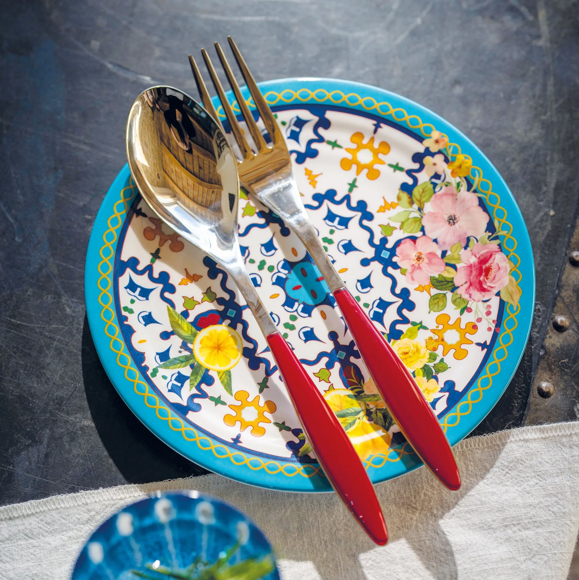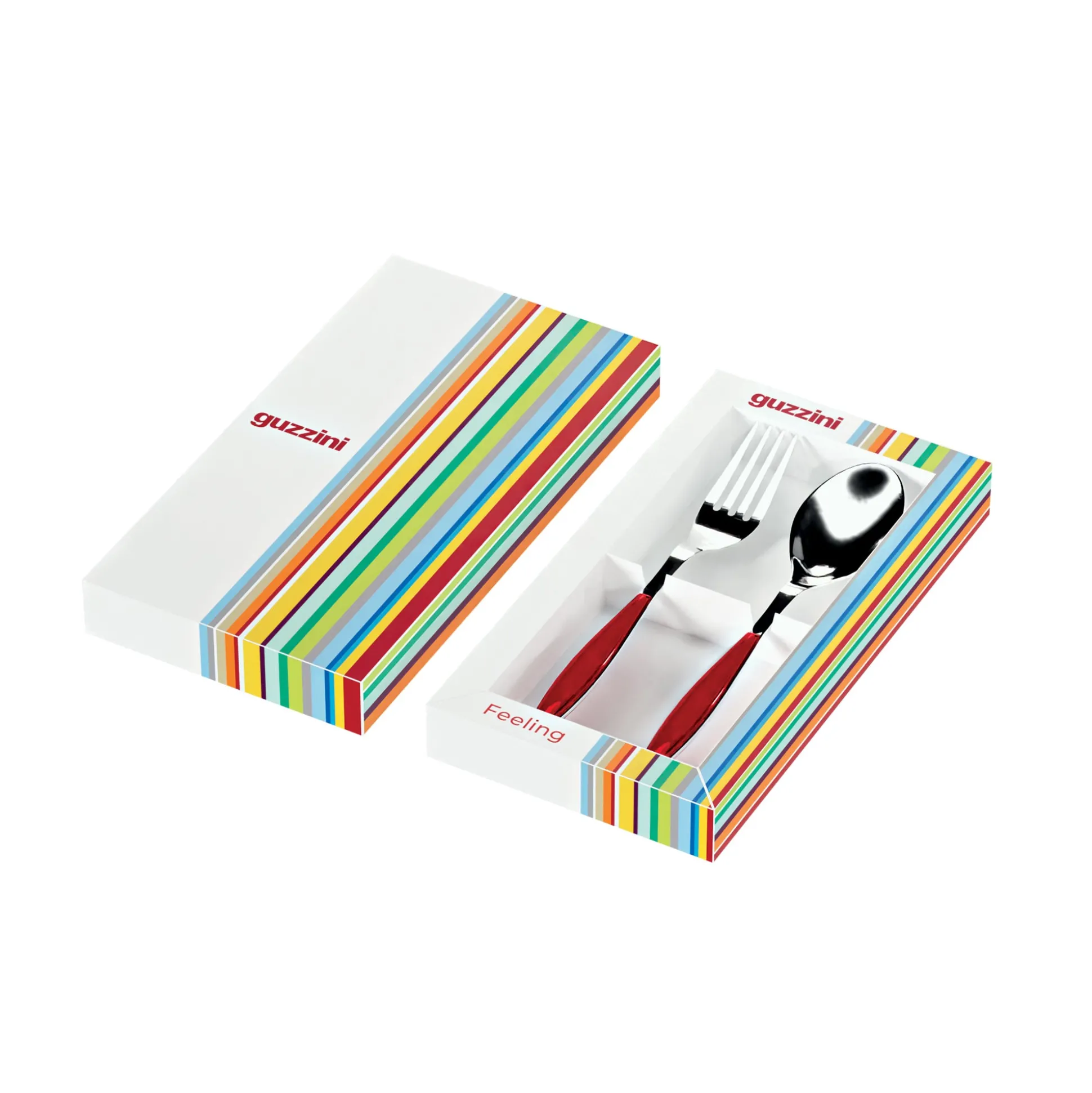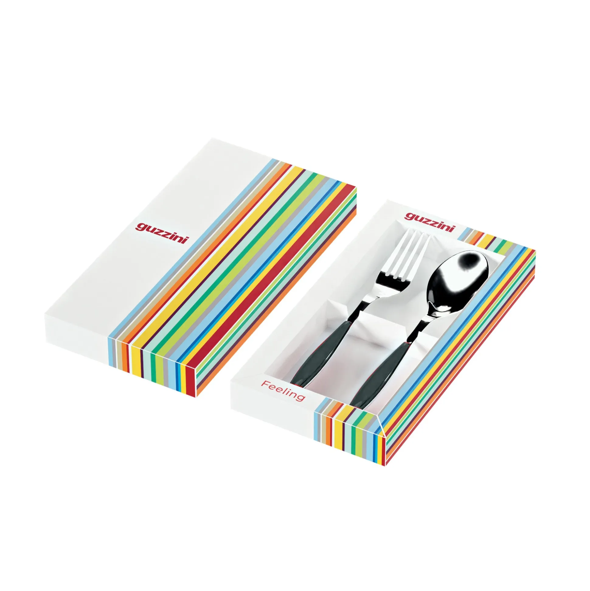 - L’acciaio percorre tutta la lunghezza della posata sul cui manico vengono applicati i preziosi elementi in plastica bicolore