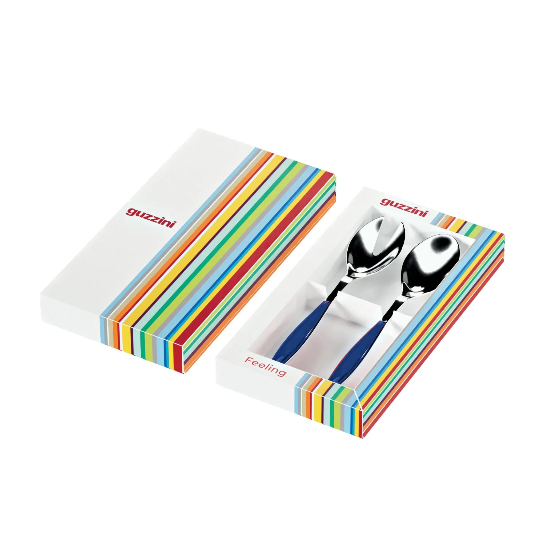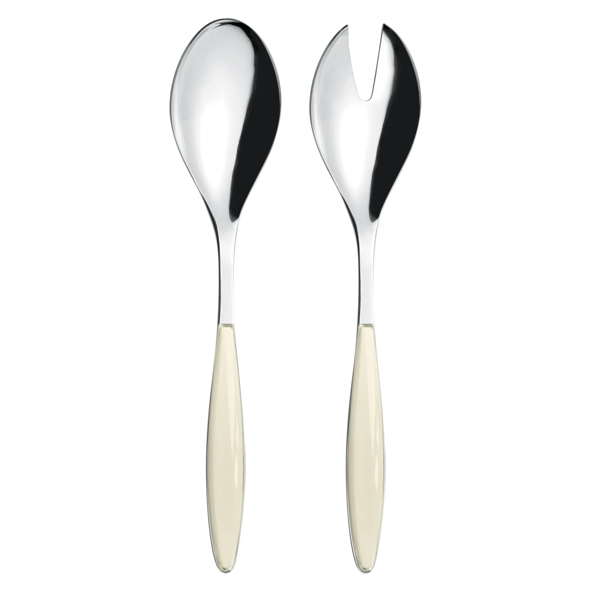 - L’acciaio percorre tutta la lunghezza della posata sul cui manico vengono applicati i preziosi elementi in plastica bicolore
