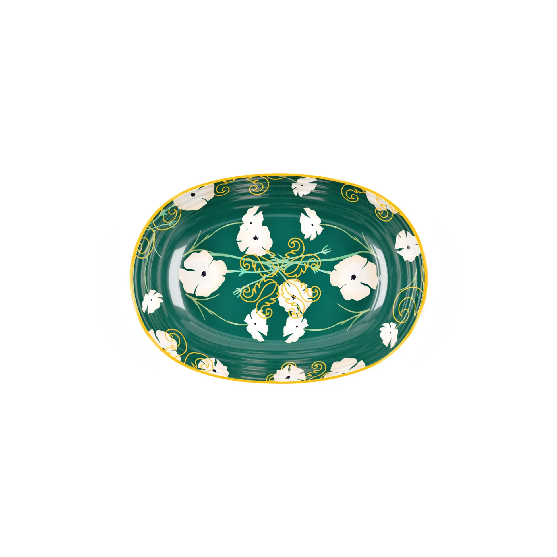 La risottiera in melamina ‘’Fusion’’ offre un’originale combinazione di colori e stili. Il verde intenso abbinato al bianco dei fiori e all’oro dei segni grafici conferiscono un aspetto elegante, adatto ad ogni stagione e ad ogni occasione. Ideale anche come un piatto a servire o un centrotavola per ospitare la frutta.