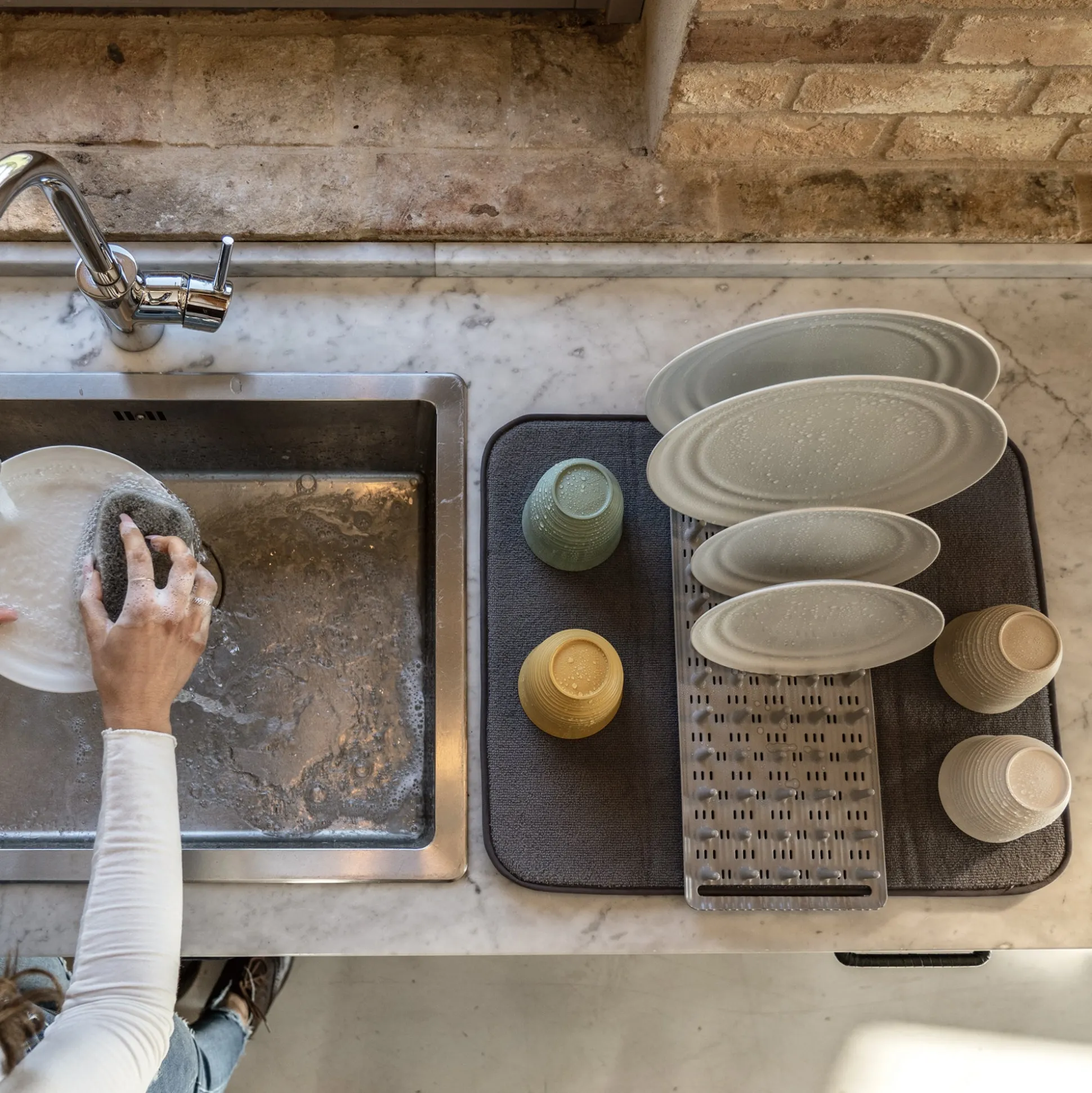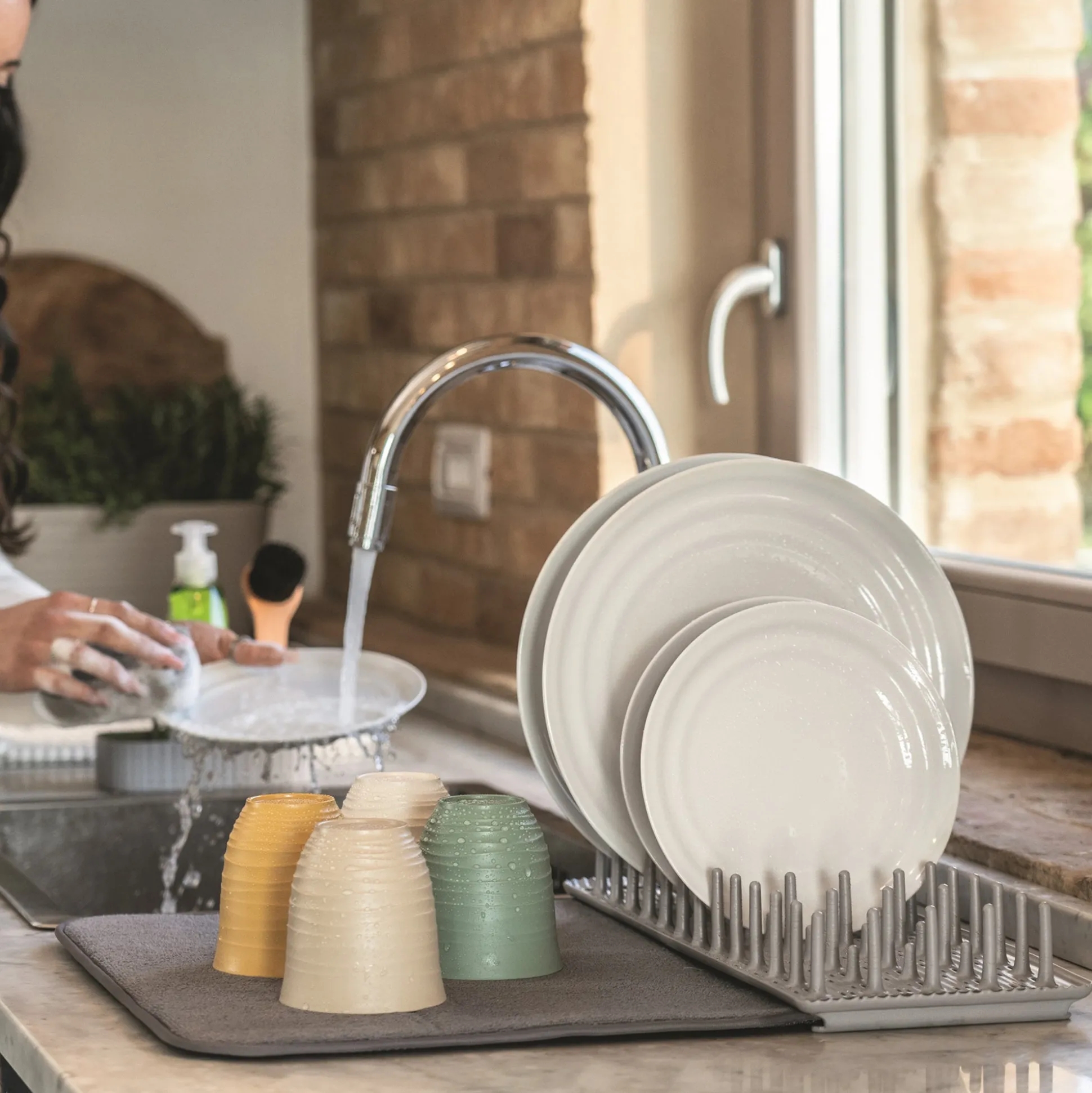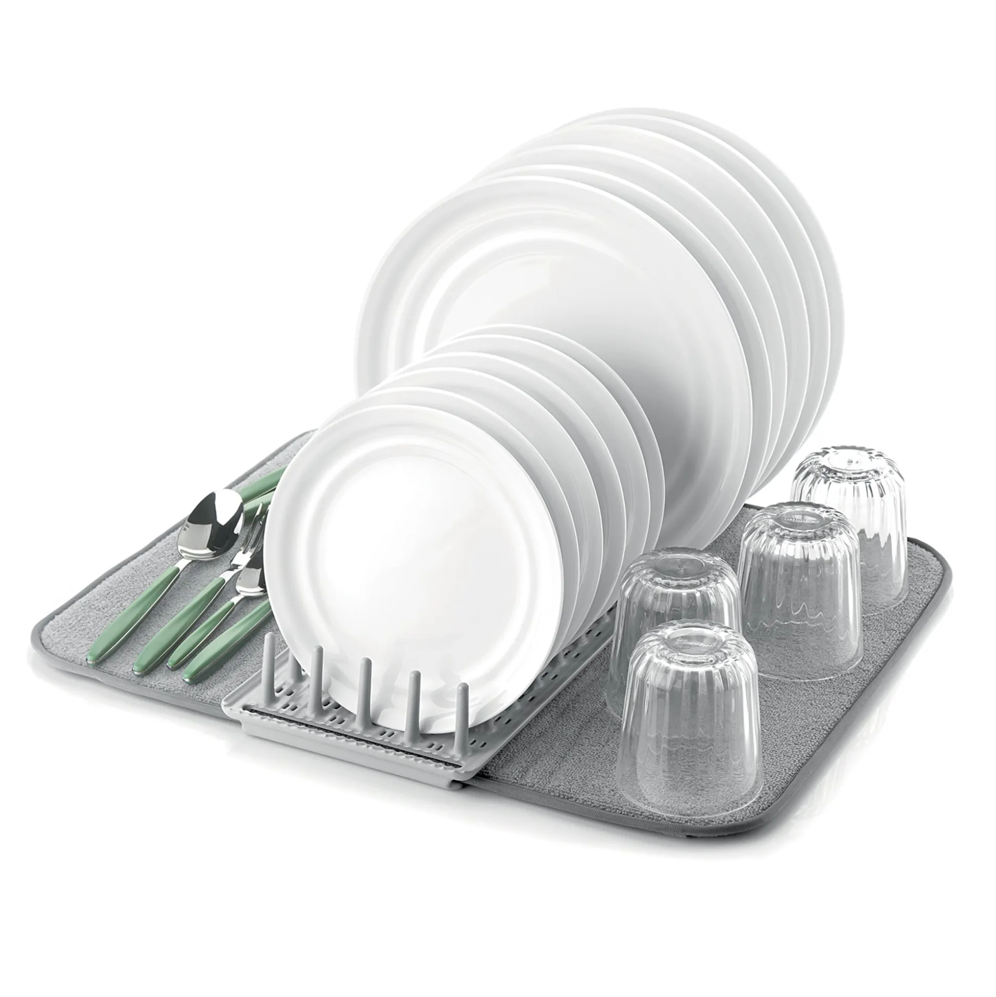 Versatile scolapiatti formato da un pratico tappetino in materiale assorbente e una rastrelliera realizzata riciclando 3,6 flaconi in plastica usa e getta 100% post consumo e antibatterica che ospita fino a 12 piatti.