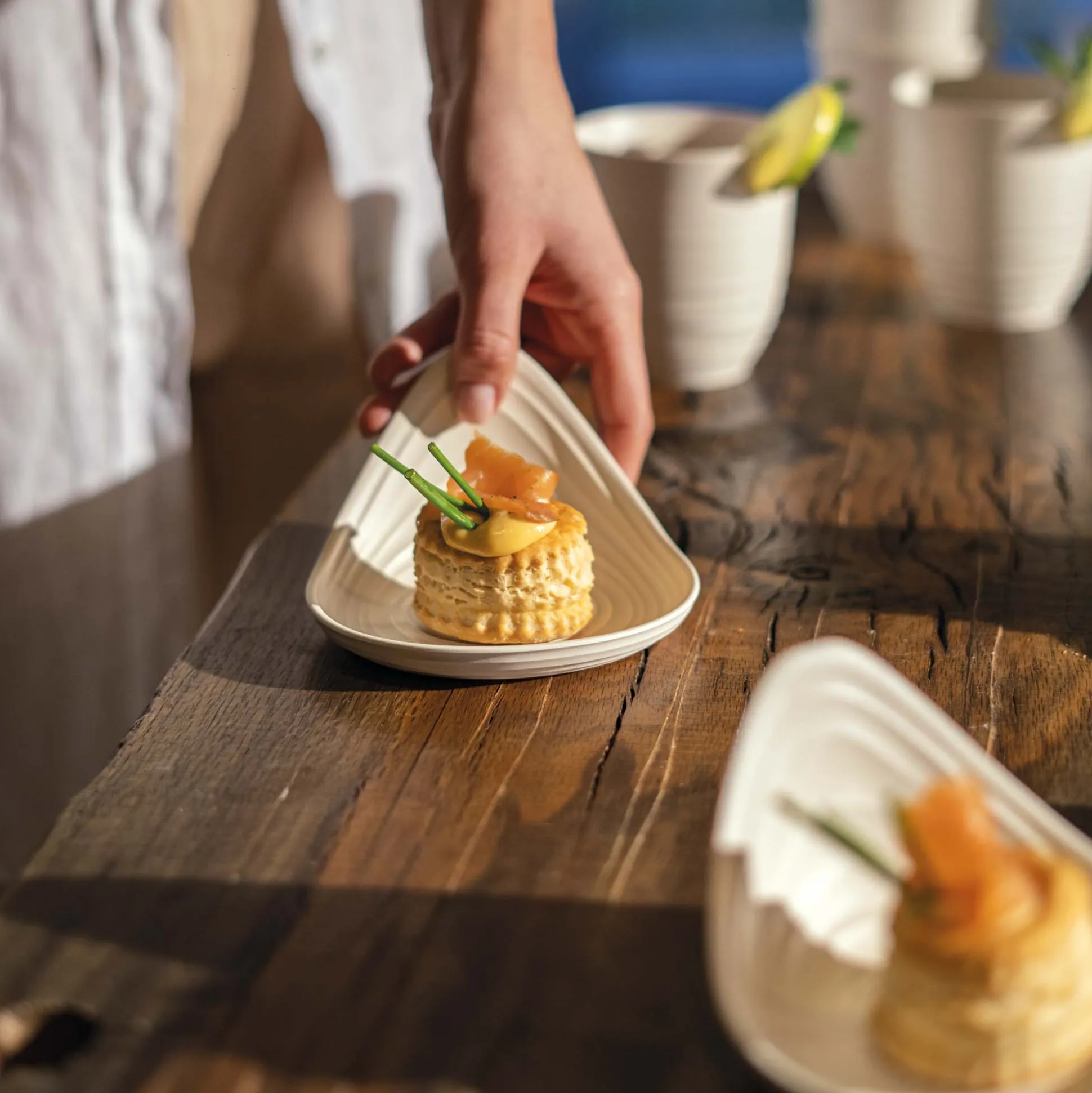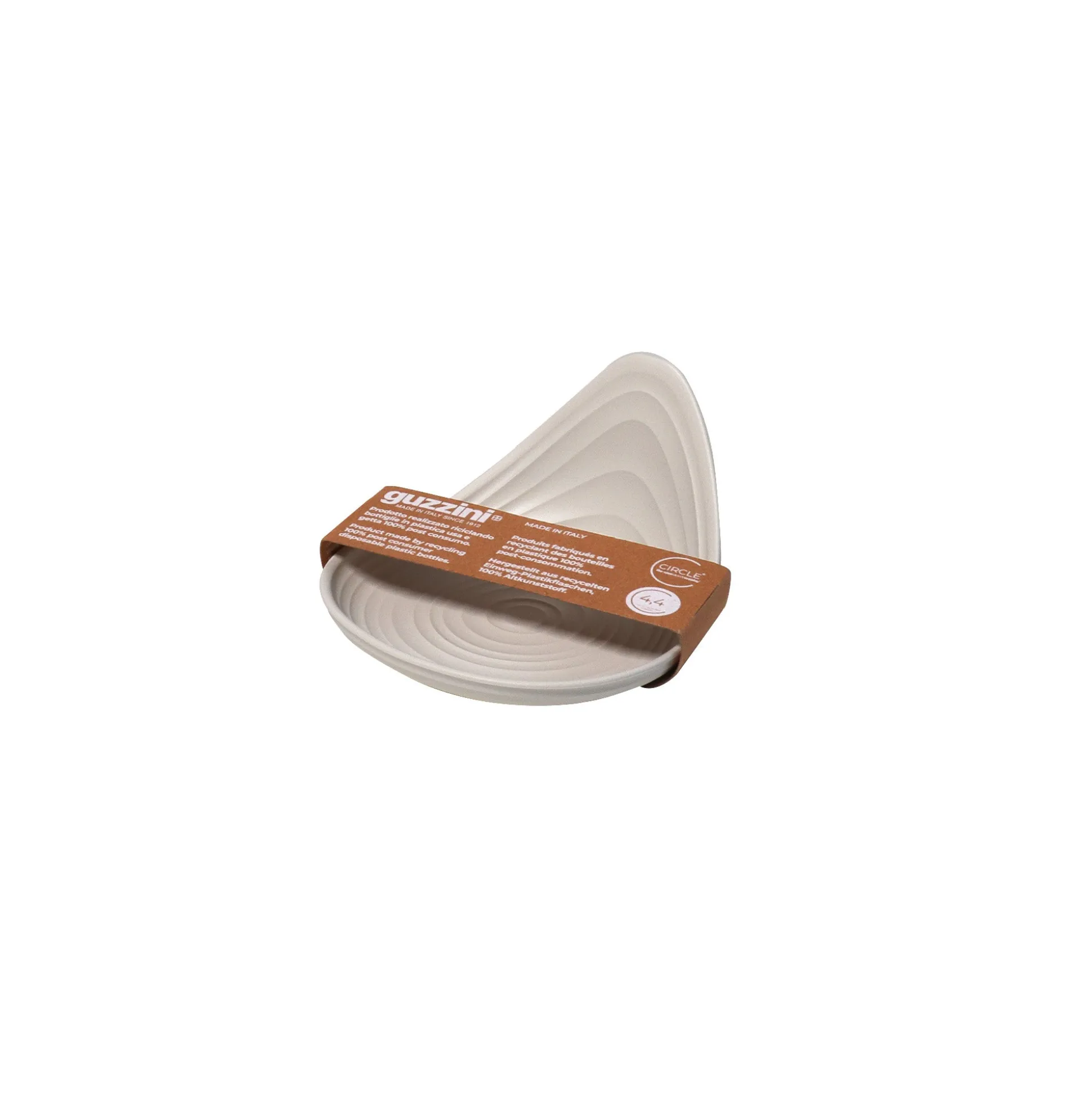 Un piattino rotondo con un’ala laterale, elemento che dona originalità, facilita la presa del piattino stesso e permette di appoggiare snack al suo interno. Inoltre la sua impilabilità gli garantisce il plus di essere facile da riporre e salva-spazio.