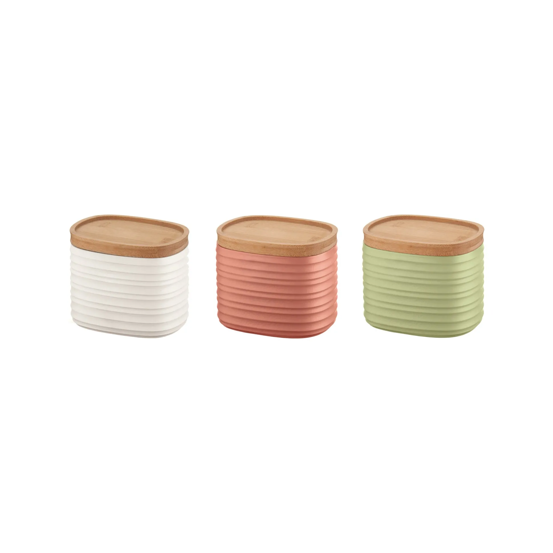Set 3 barattoli impilabili realizzati riciclando 14,7 e 22,2 bottiglie d’acqua usa e getta 100% post consumo. Il coperchio, in legno di bamboo, è salvafreschezza. Ideali per conservare zucchero, sale, ma anche spezie e caffè.