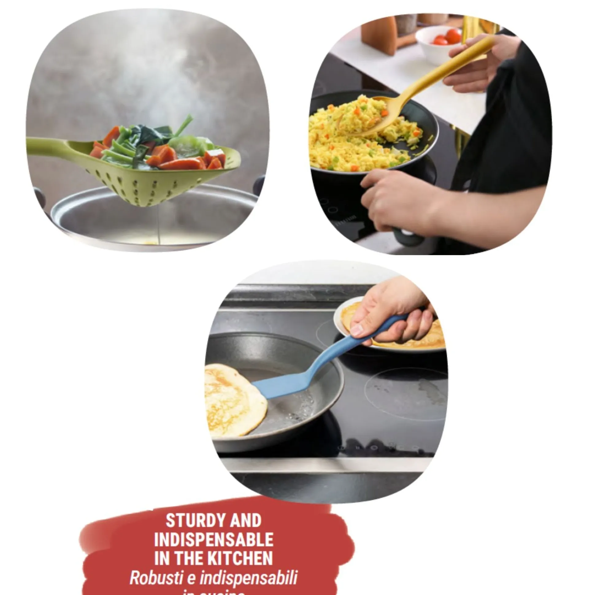 Una linea completa di utensili per la preparazione di un’ampia varietà di alimenti. Colorati e di design, sono idonei per ogni tipo di pentolame.