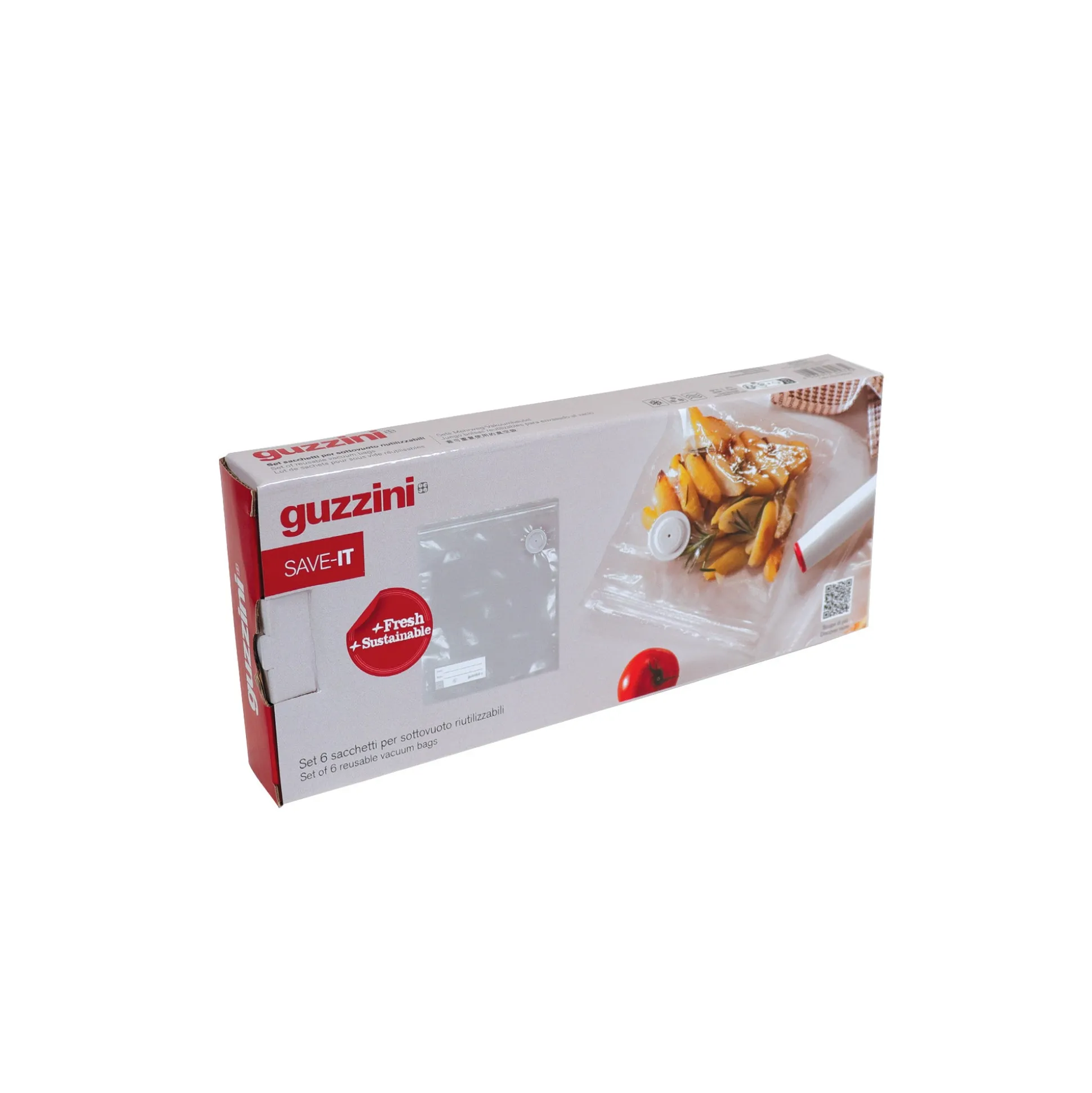 I sacchetti per la conservazione sottovuoto dispongono di una valvola per l’estrazione dell’aria e di un apposito spazio per scrivere la data di confezionamento del cibo contenuto.