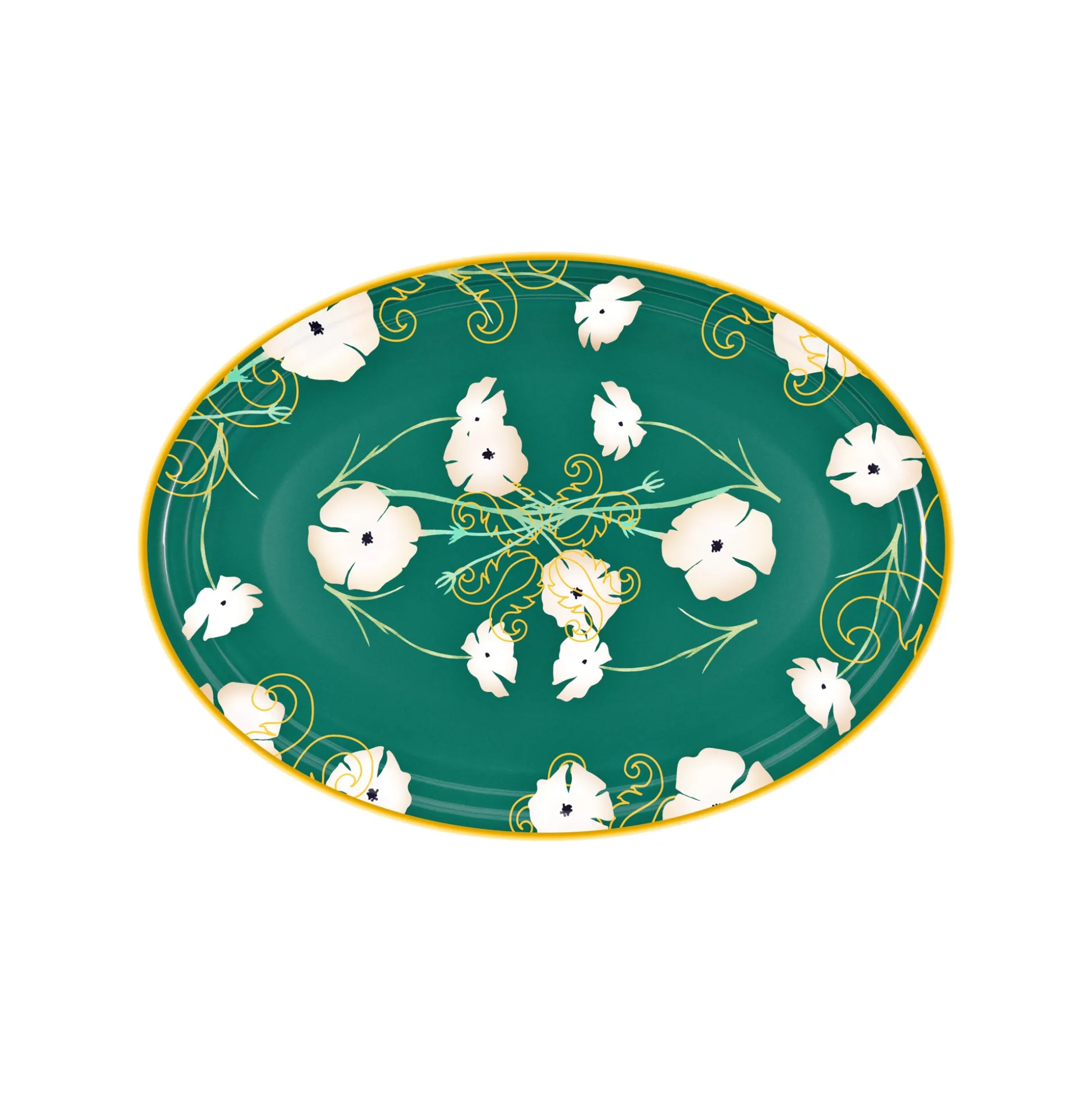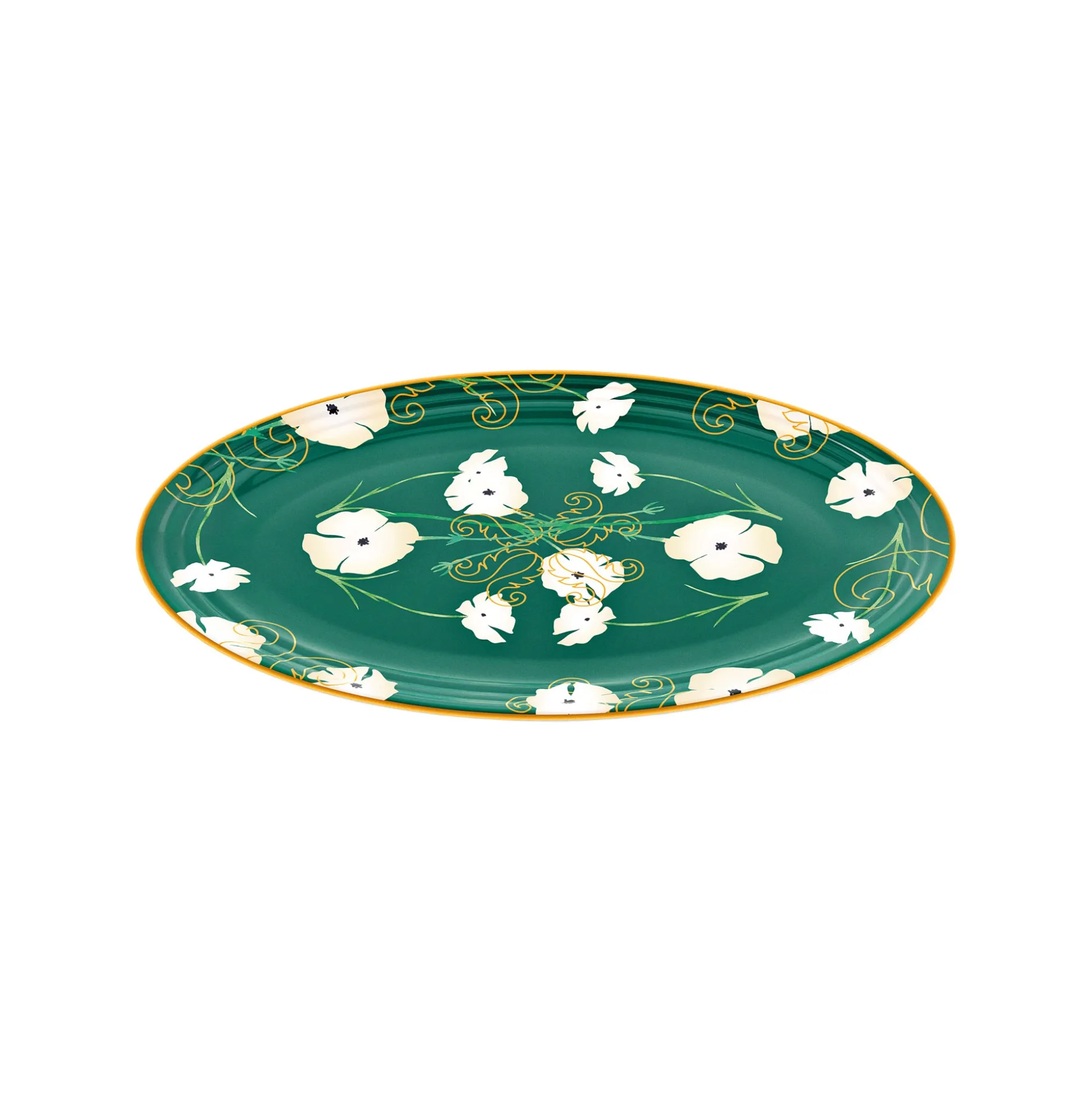 I vassoi in melamina ‘’Fusion’’ offrono un’originale combinazione di colori e stili. Il verde intenso abbinato al bianco dei fiori e all’oro dei segni grafici conferiscono un aspetto elegante, adatto ad ogni stagione e ad ogni occasione.
