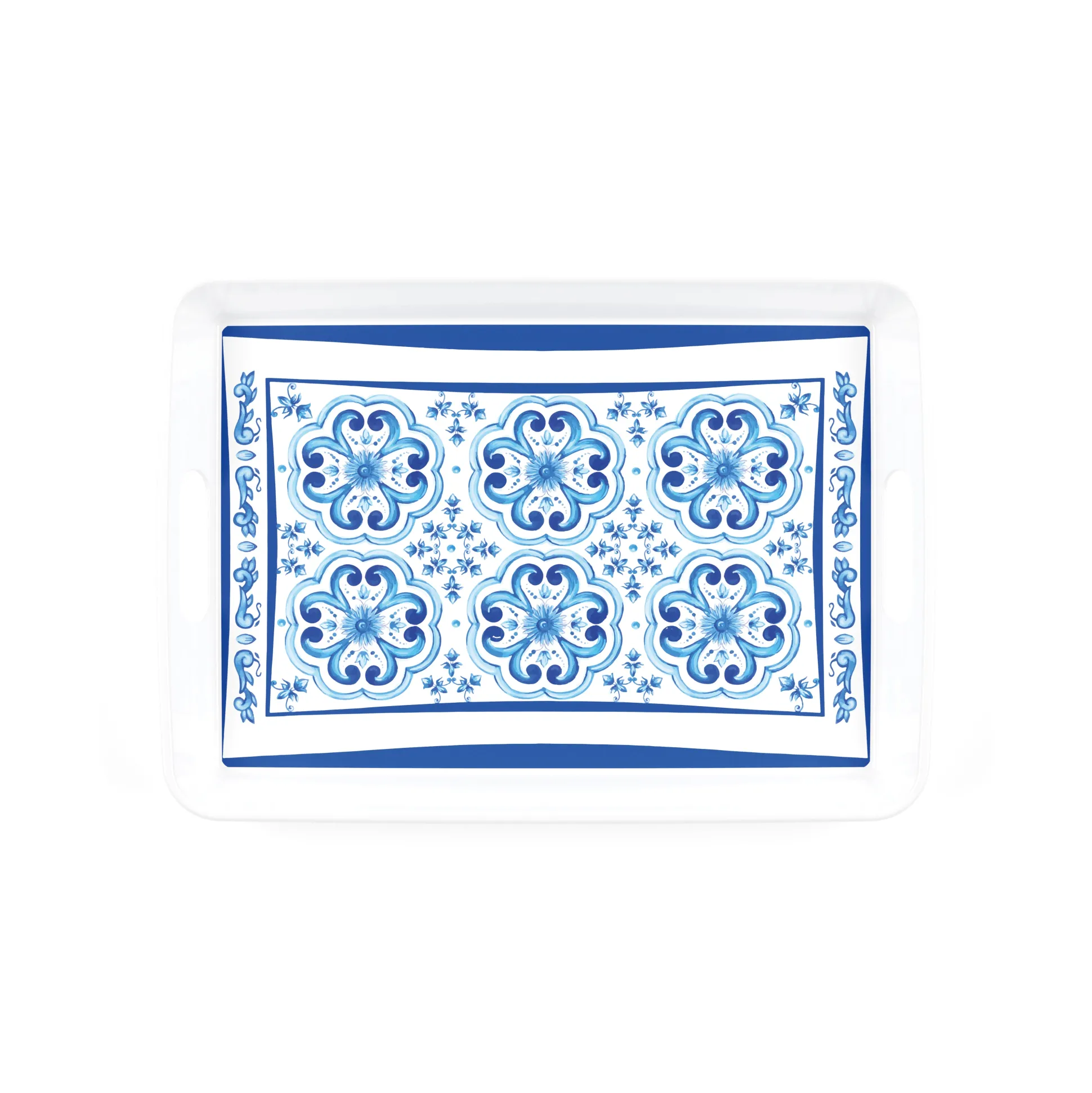 Il vassoio rettangolare con manici in melamina “Blues” ci riporta alla vitalità del mare: i toni azzurri intensi e i disegni sinuosi parlano d’estate, della freschezza dell’acqua, di panorami mozzafiato a bordo di una barca o sul bordo di una piscina per una tavola elegante e distintiva.
