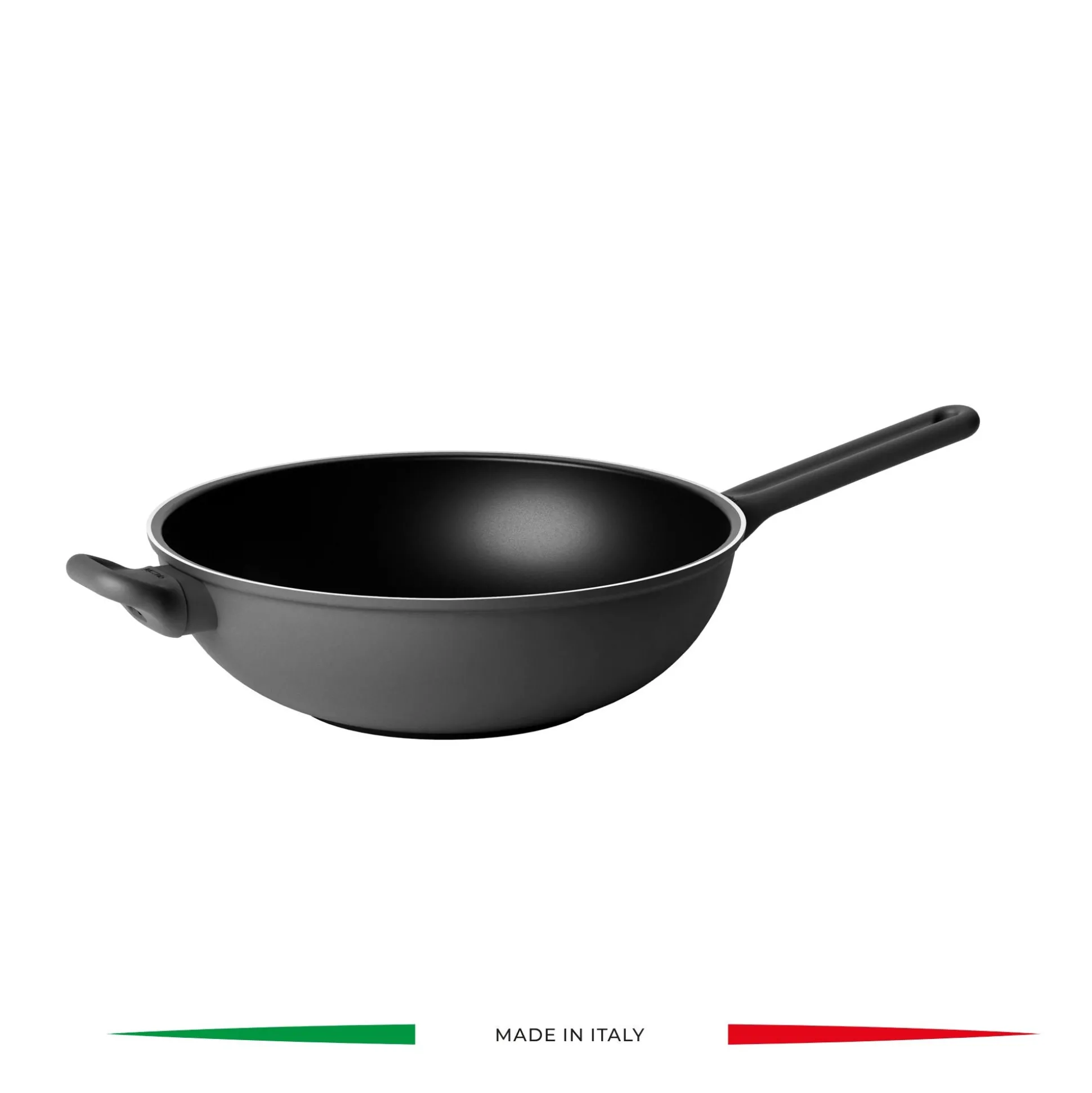 - Caratteristiche di primo livello, come il corpo in alluminio riciclato e riciclabile forgiato ad alto spessore e sabbiato, ne garantiscono un’alta efficienza energetica ed una distribuzione uniforme del calore durante la cottura.